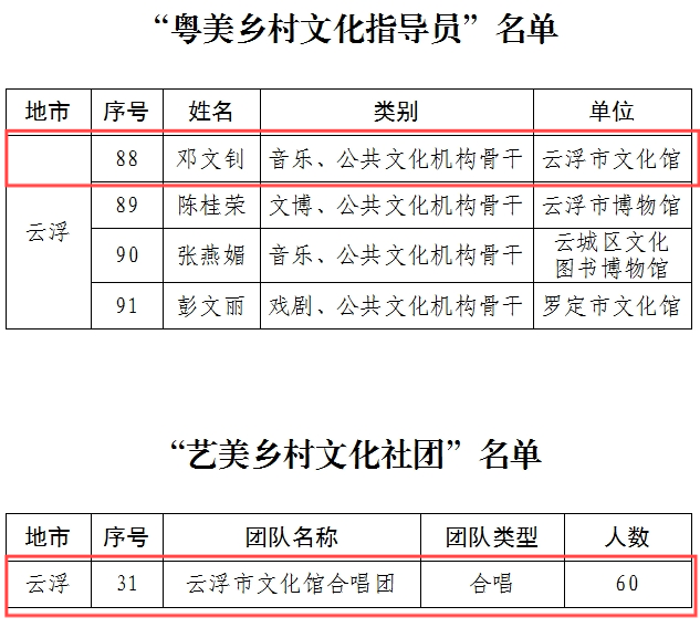 近日,广东省文化和旅游厅公布第二批“粤美乡村文化指导员”“艺美乡村文化社团”名单,全省共评选出“粤美乡村文化指导员”92人、“艺美乡村文化社团”31个。其中,云浮市文化馆邓文钊获评“粤美乡村文化指导员”称号;云浮市文化馆合唱团获评“艺美乡村文化社团”称号。