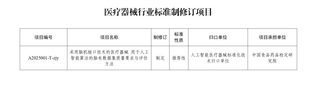 国家药监局对脑机接口技术的医疗器械行业标准立项