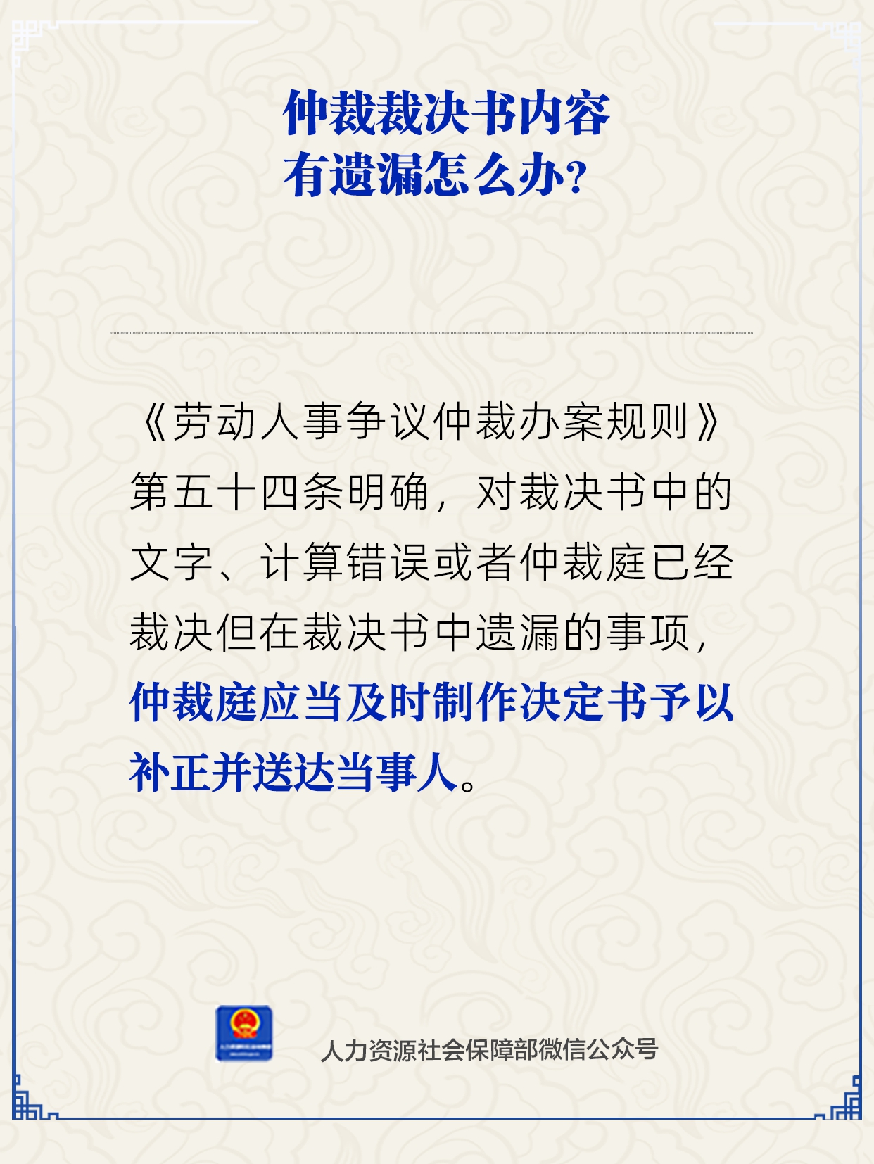 仲裁裁决书内容有遗漏怎么办?人社部19日通过官方微信公众号作出解答。