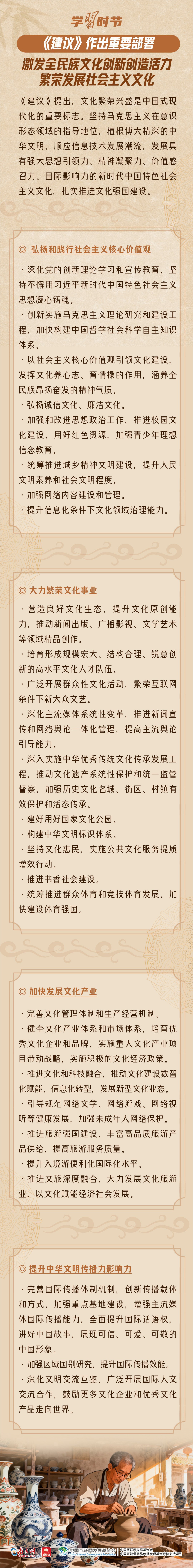 “当今世界正处于百年未有之大变局。”习近平总书记这一重要论断,深刻揭示了全球新的时代特征。在百年未有之大变局中,中国面临前所未有的机遇与挑战。要在文化传播全球化和数字化的新时代浪潮中,切实抓好机遇、有力应对挑战,需要我国的国家软实力持续提高。《建议》从四方面作出重要部署,明确激发全民族文化创新创造活力、繁荣发展社会主义文化的具体路径。