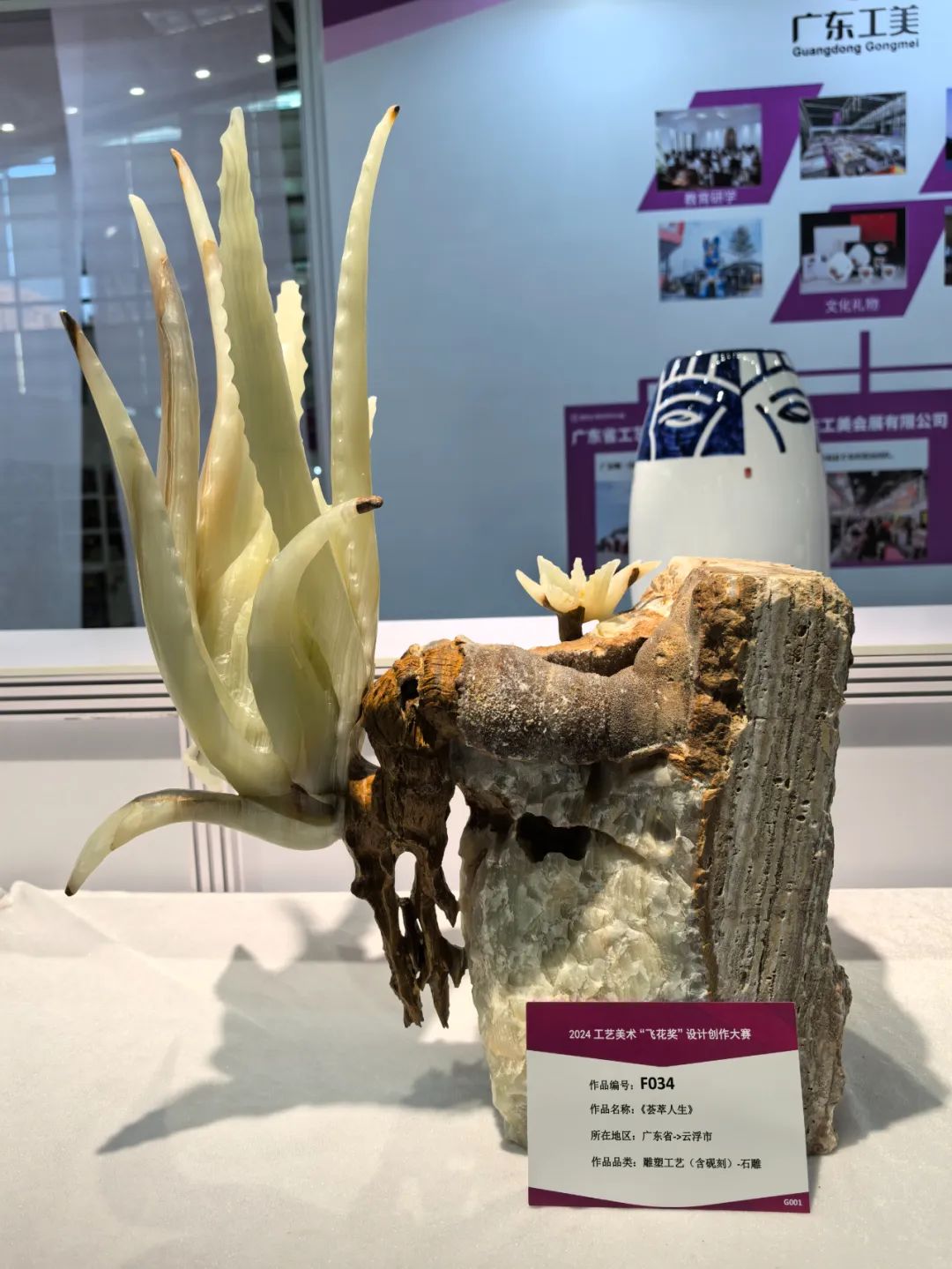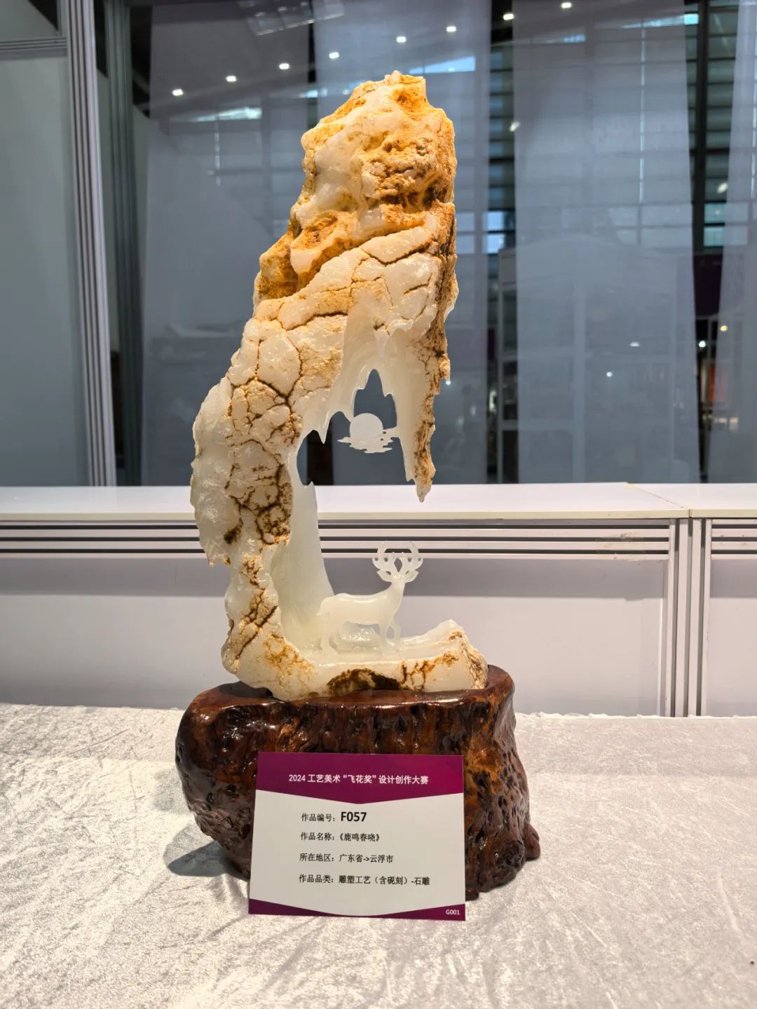 在此次博览会上,云浮市选送的11件作品亮相广东省工艺美术协会举办的2024工艺美术“飞花奖”设计创作大赛,其中《荟萃人生》《高枕无忧》《鹿鸣春晓》《鳄之初》《盛世中华》等作品更是摘得2金、1银、2铜的佳绩,成为展会的一大亮点。这些作品不仅是艺术家们精湛技艺的结晶,更是云浮石雕工艺传承与创新的生动写照。俗话说:“台上一分钟,台下十年功。”优秀的作品绝非轻而易举就能创作出来,每一件获奖作品的背后,都凝聚着“巧工匠”们“甘坐冷板凳”的辛勤付出。