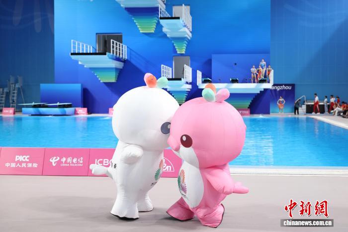 11月11日,第十五届全国运动会跳水项目女子3米跳板决赛在广东省奥体中心游泳跳水馆举行。图为比赛前,十五运会吉祥物带来暖场表演。中新社记者 陈楚红 摄