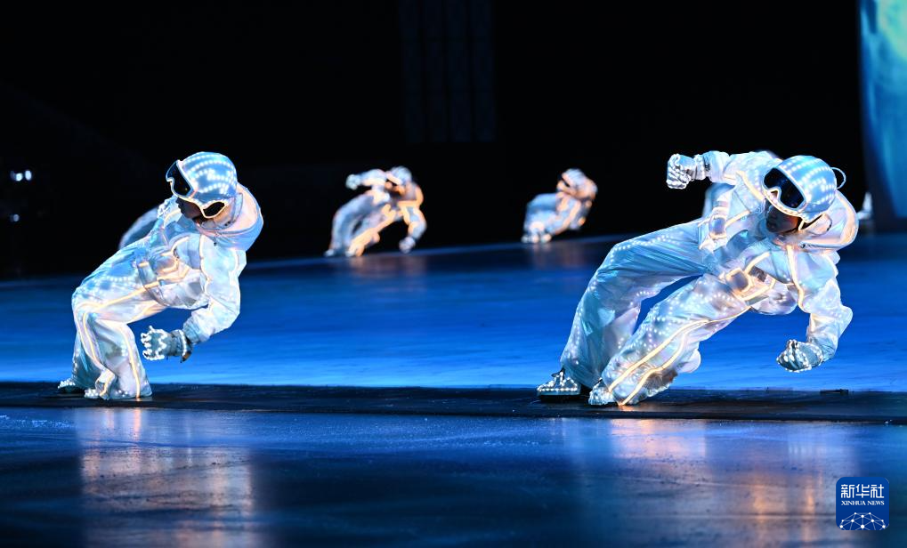 数十位演员身着集创意电子和智能编程为一体的数控发光服装,做出速度滑冰摆臂、背手、搓雪回转等专业动作;
