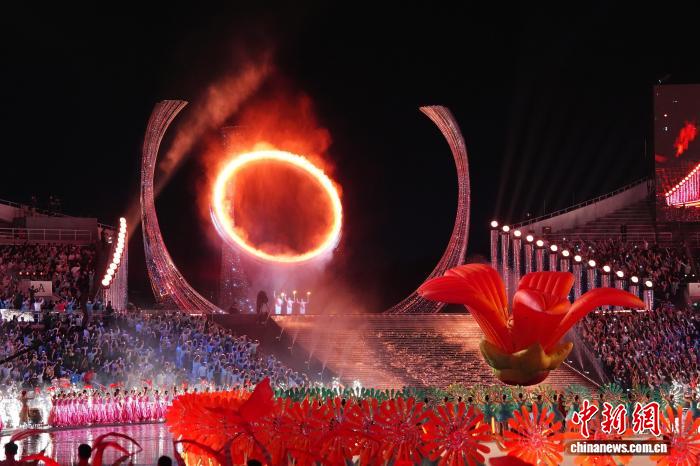 11月9日晚,第十五届全国运动会开幕式在广东奥林匹克体育中心举行。图为主火炬被点燃。 中新社记者 杨华峰 摄