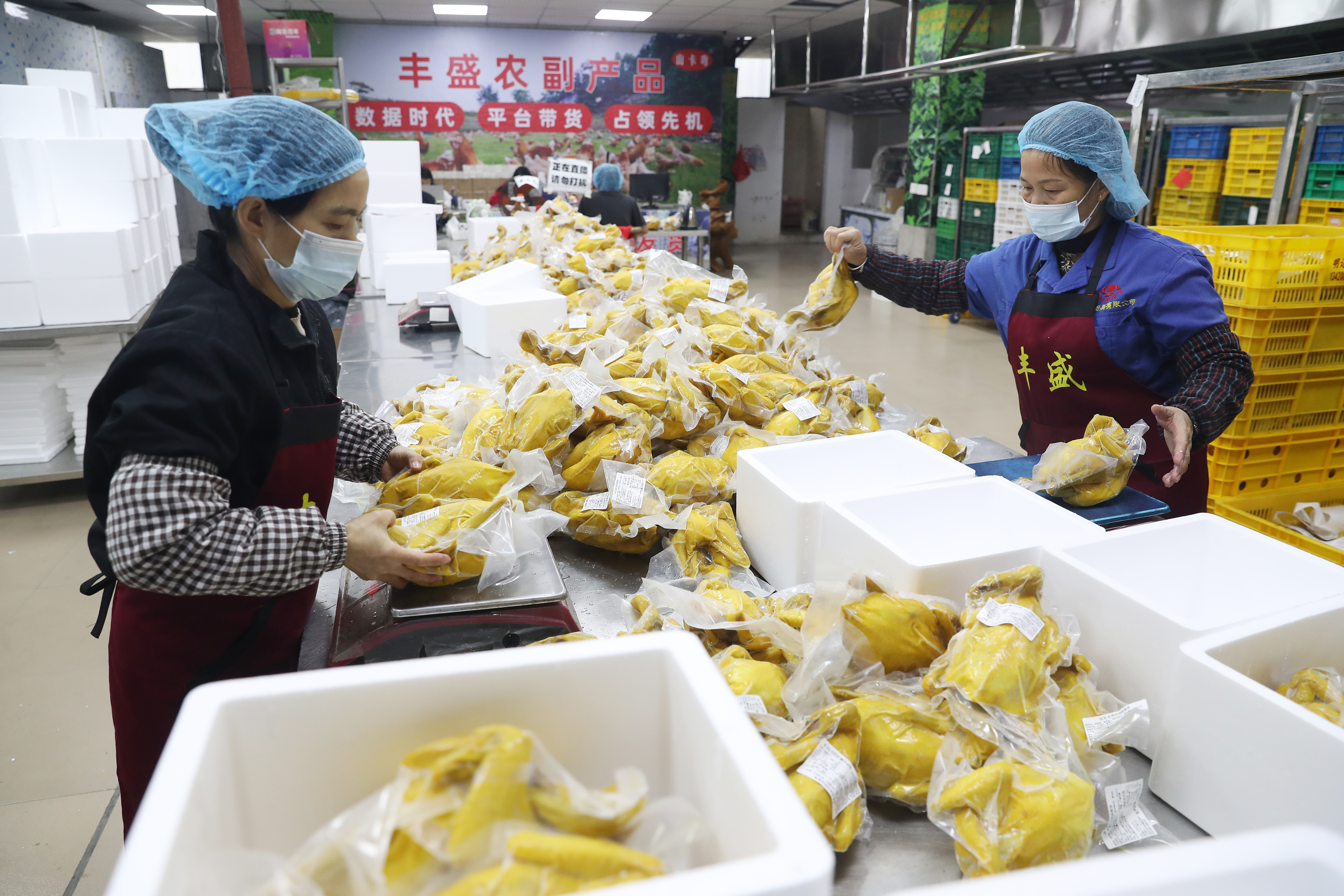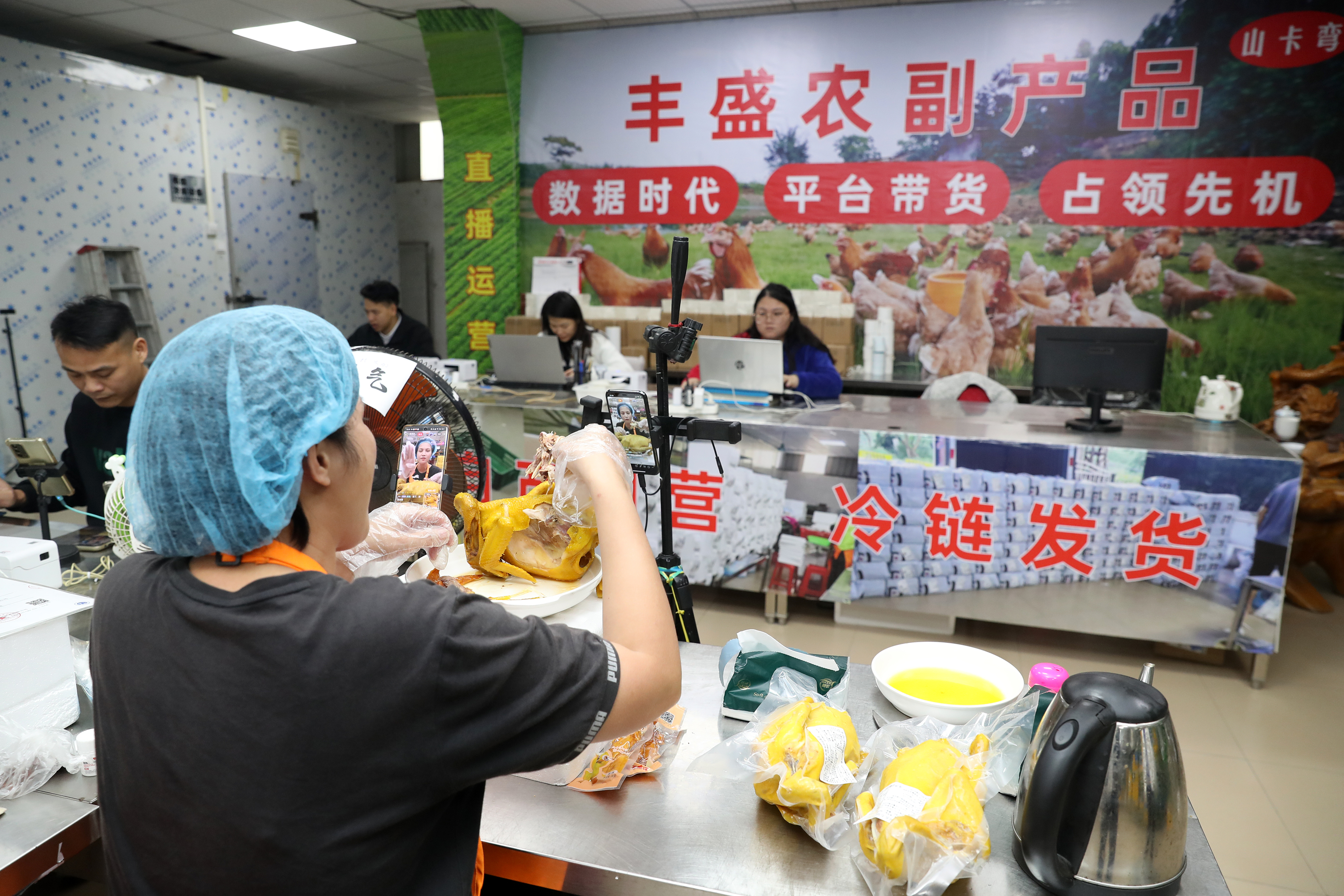 在云城区云城街道土门村云浮市丰盛农业科技有限公司的直播运营中心,盐焗鸡的香味扑鼻而来,主播正通过网络平台与“粉丝”们热情互动、推介公司的优质农产品;直播间旁边,是公司的“发货车间”,工人们把堆成小山的真空包装熟食盐焗鸡按订单放进泡沫箱里,优质的“云字号”农产品将会通过物流快递走进千家万户。