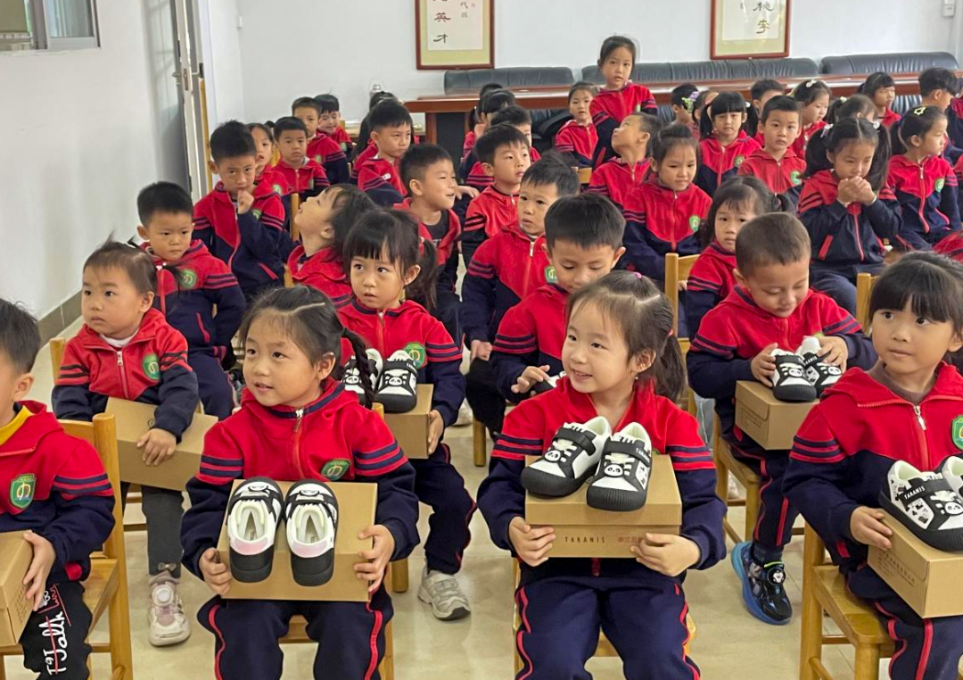 在罗定市培英博艺幼儿园举行的捐赠仪式上,广东省希贤教育基金会联合广东恒松控股集团向该园捐赠一批价值十五万元的童鞋,并有序分发到每个孩子手中。