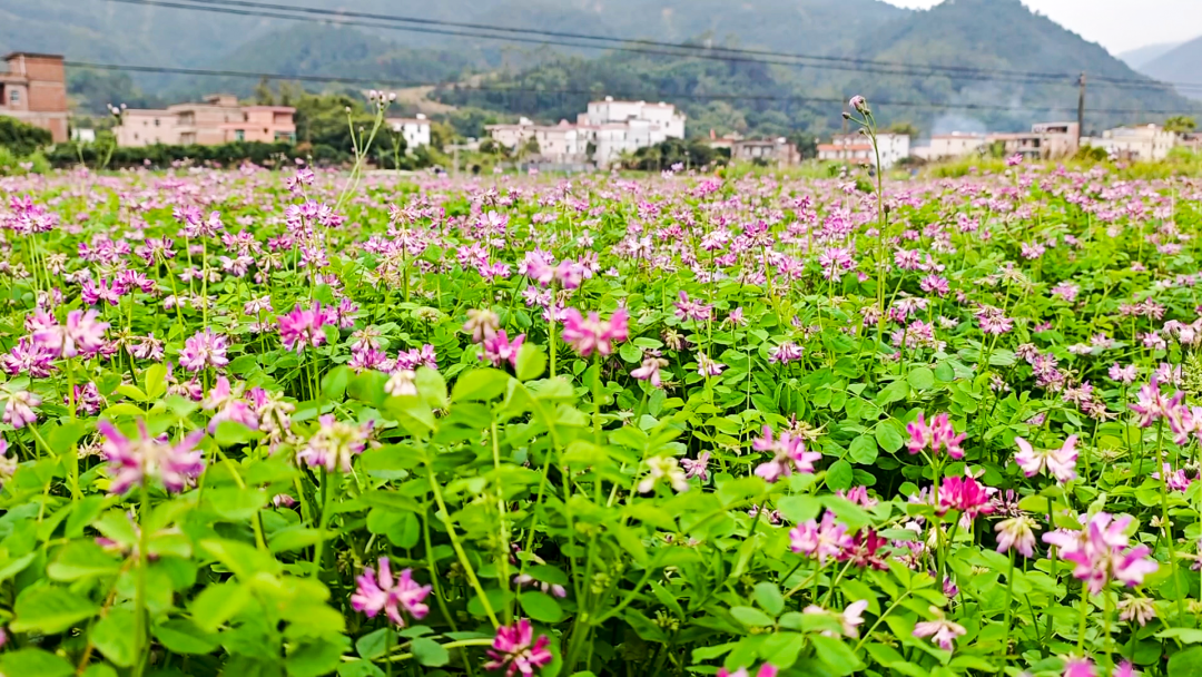 在分界镇石牌村李屋角自然村,连片紫云英正值盛花期,形成了规模化绿肥种植示范景观。“种了紫云英后受益很多。第一是疏松土壤,减少土地板结;第二是售卖种子,增加收入。开花很漂亮,吸引人过来游玩拍照,增加了人气。”村民李伯说。
