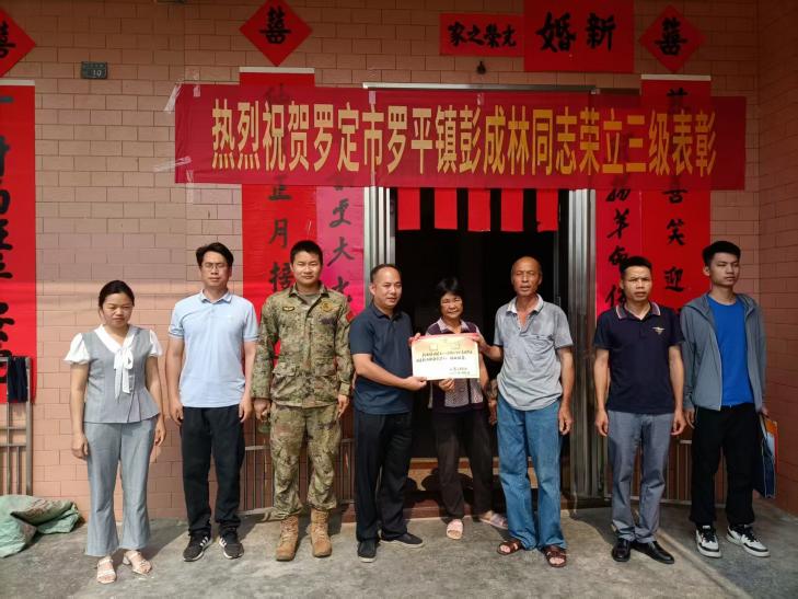4月10日,云浮罗定罗平镇政府主要领导联同镇民政、退役军人服务站相关工作人员一行,专程前往现役军人彭成林家中,向其家属送去立功喜报、荣誉证书及奖励金,面对面传递党和政府对立功军人及家属的深切关怀与崇高祝贺,切实把尊崇与温暖送到军属心坎上。