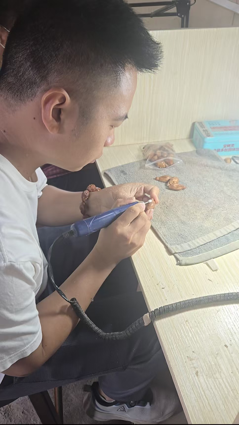 梁可钧与核雕的缘分,藏在童年的乡野记忆里。“小学时揣着橄榄核在兜里摩挲,那滑溜溜的触感记了几十年。”2014年,在广州工作的他,偶然重拾这份记忆,“网上找图、买刻刀,就这么瞎琢磨着打发时间。”