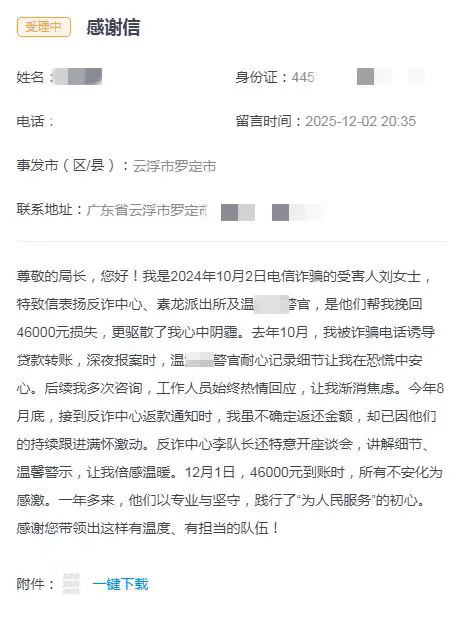 “46000元到账时,所有不安化为感激,一年多来,他们以专业与坚守践行了为人民服务的初心,感谢您带领出这样有温度,有担当的队伍。”近日,群众刘女士通过“局长信箱”向罗定市公安局发来一封感谢信。信中对反诈中心、素龙派出所及该所温警官在2024年10月其遭遇电信诈骗后,历时一年多不懈努力,最终为其全额追回46000元经济损失表示由衷感谢,并对民警高度的责任心与温暖的工作态度给予了高度赞扬。