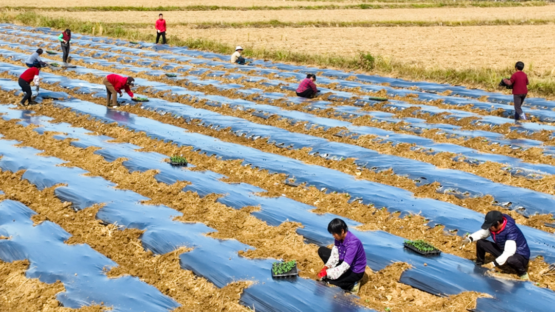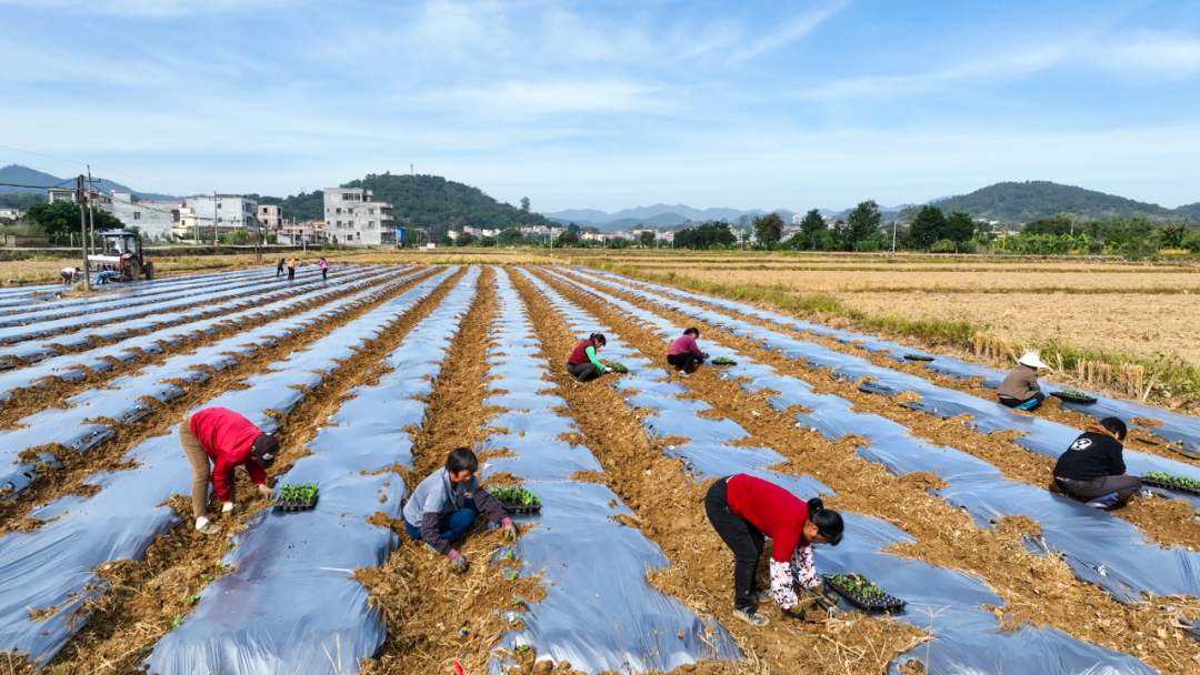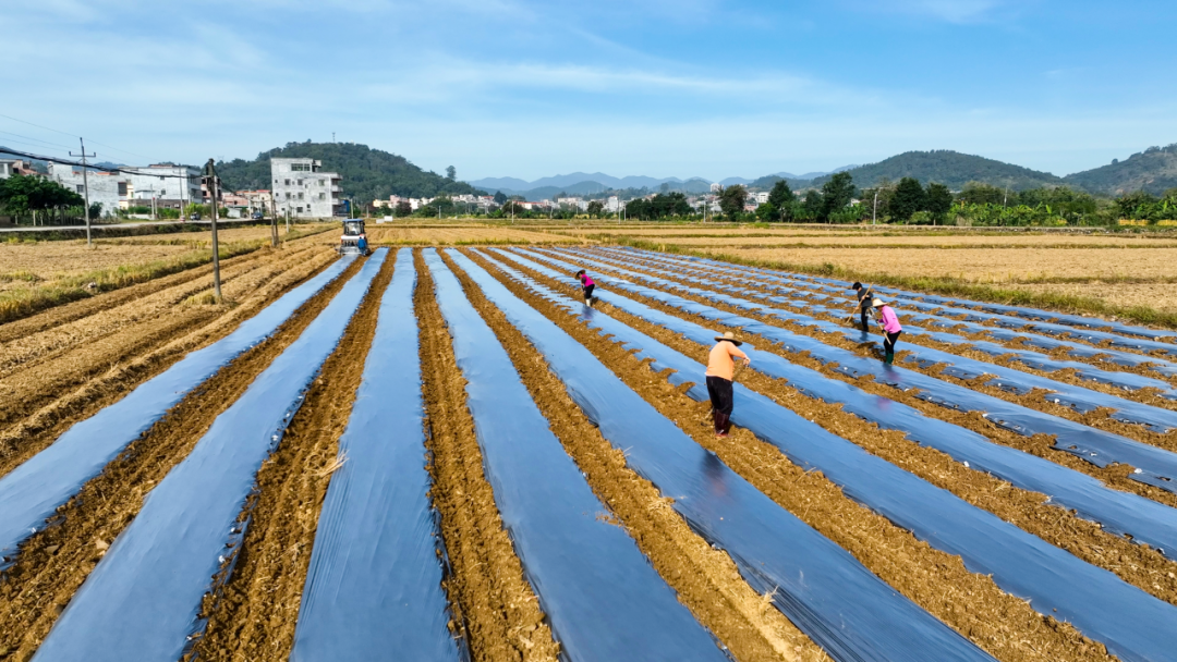 近日,罗定融媒记者在泗纶镇山栗村垦造水田项目冬种现场看到,数十名工人分工协作,忙于拉膜、种苗、淋水等工作,抢抓农时种植贝贝南瓜,田间地头一派忙碌景象。