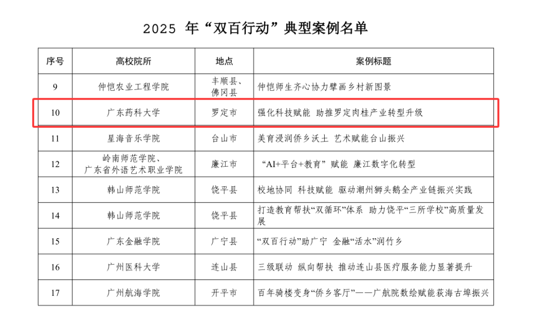 近日,广东省“百千万工程”指挥部“双百行动”专班公布了2025年“双百行动”典型案例评选结果:广东药科大学《强化科技赋能,助推罗定肉桂产业转型升级》案例,成功入选产业发展科技支撑类典型案例。