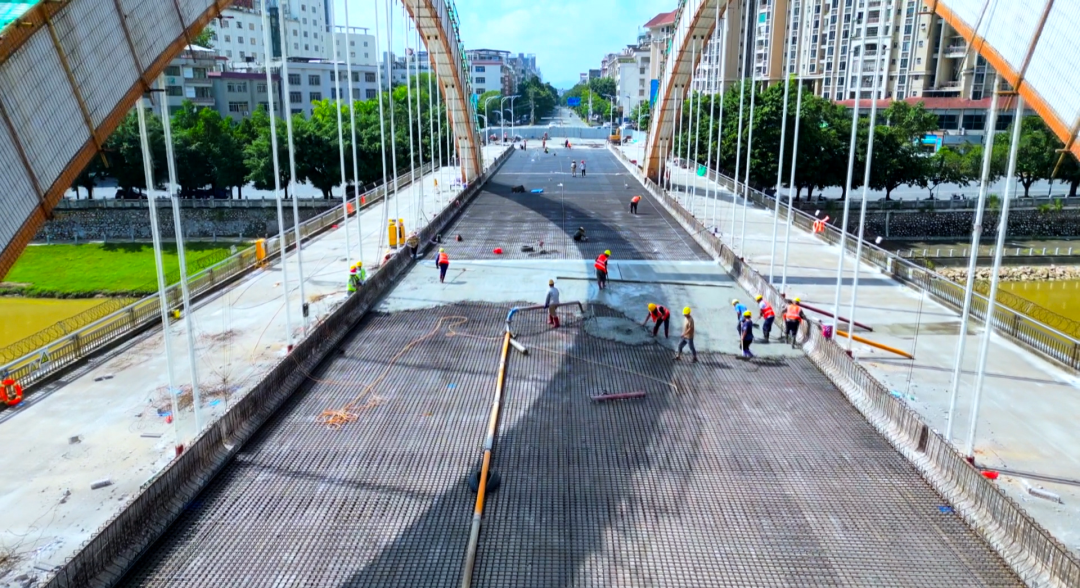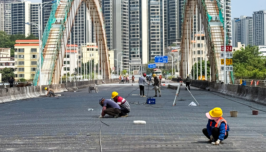改造工程自5月6日启动以来,先后完成了主拱肋裂缝灌浆修补、局部混凝土裂缝修补、全桥吊杆和支座更换、伸缩缝更换以及桥面铺装重铺等关键工序。