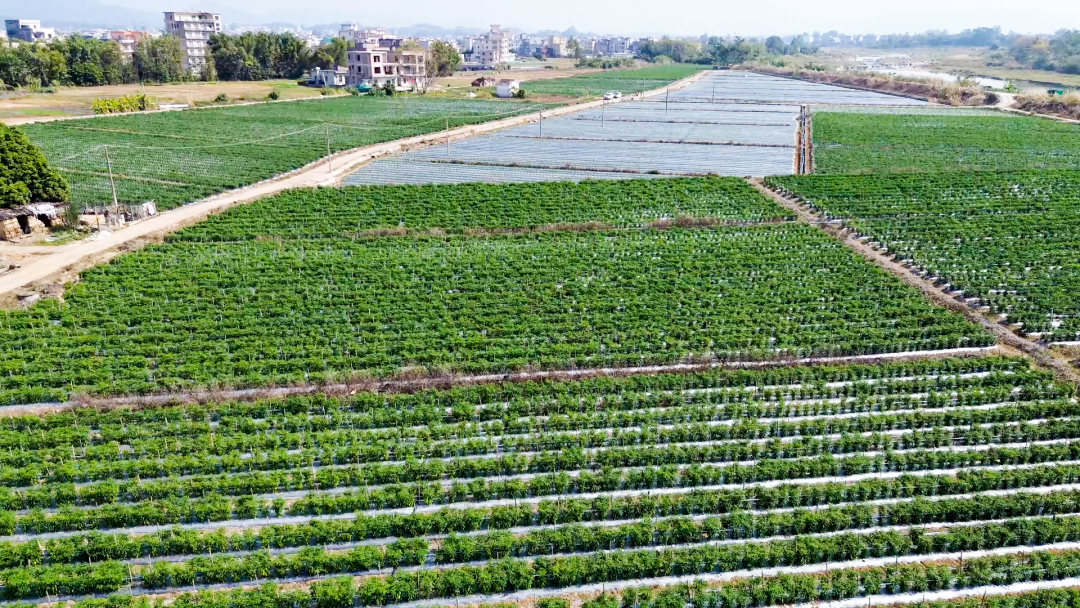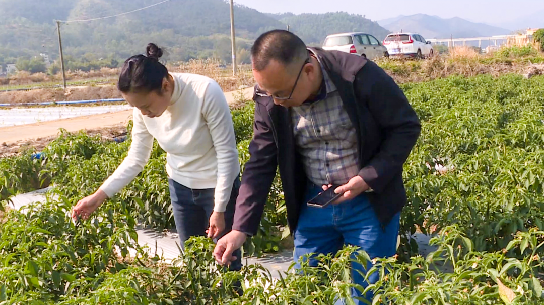在镜坡村的辣椒种植基地,一排排齐膝高的辣椒植株郁郁葱葱,枝叶之间挂满成熟待摘的冬椒。“我们的辣椒品种有8号青米、红椒、黄贡椒等,现在生长情况良好,部分已经结果,预计将在2月中旬正式收成上市。”陈灿家庭农场销售负责人陈聪敏说。