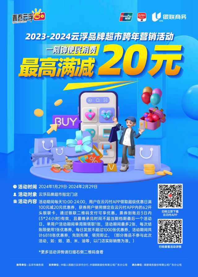 银联公司以“粤刷粤精彩”和“云浮市超级优惠日”为主题,围绕家电、家具、餐饮、超市等开展促消费活动,配套满额立减(100-20)措施。