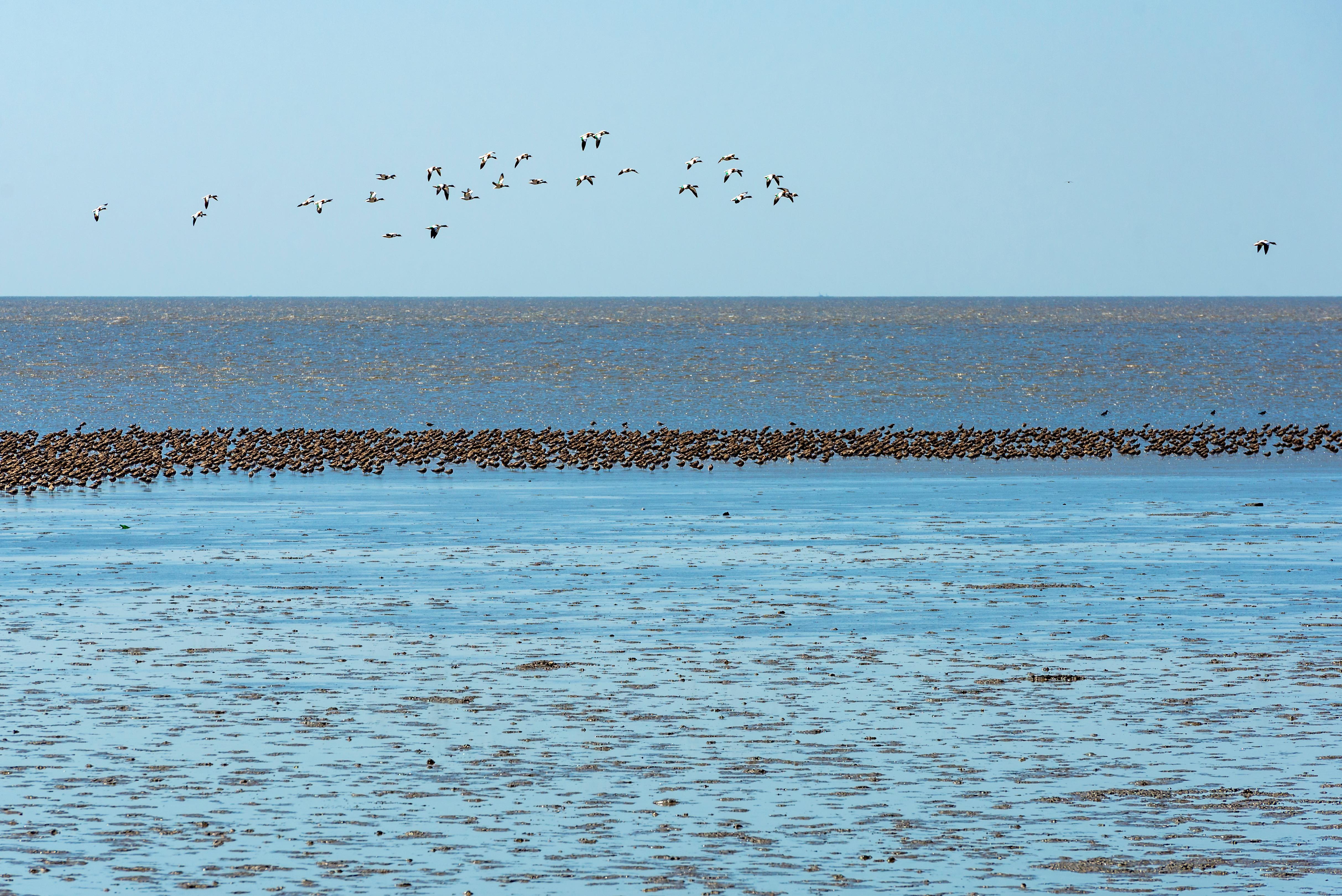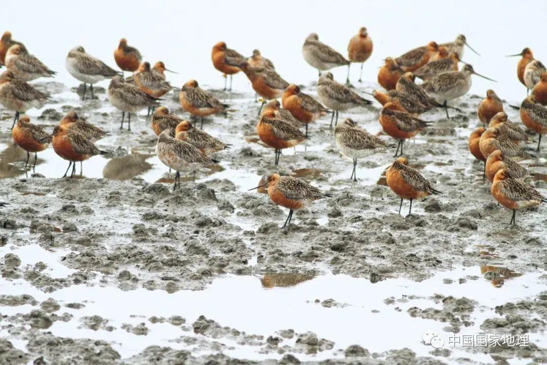 除了斑尾塍鹬,春季的鸭绿江口滨海湿地还有数万只大滨鹬栖息。