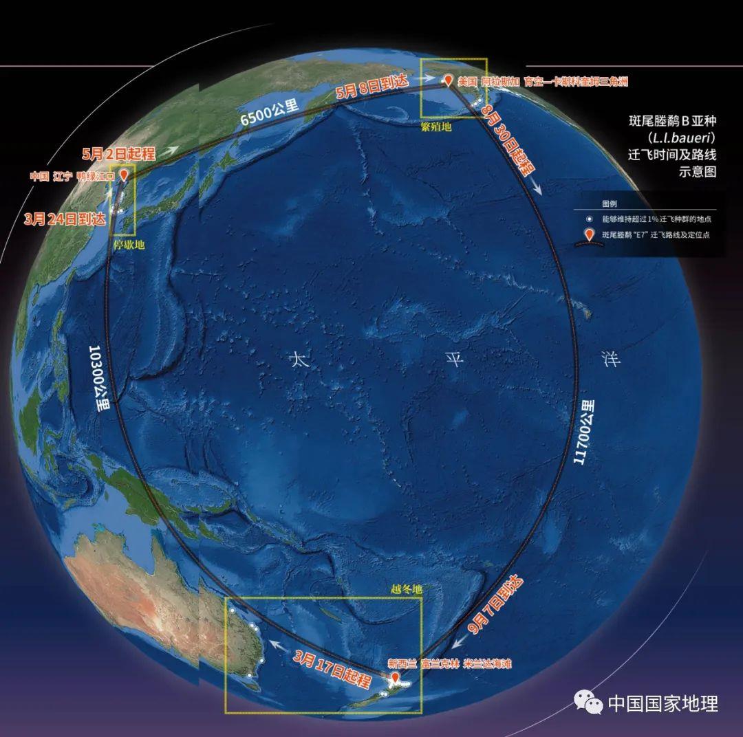 △斑尾塍鹬B亚种(L.l.baueri)迁飞时间及路线示意图。图片来源:《中国国家地理》