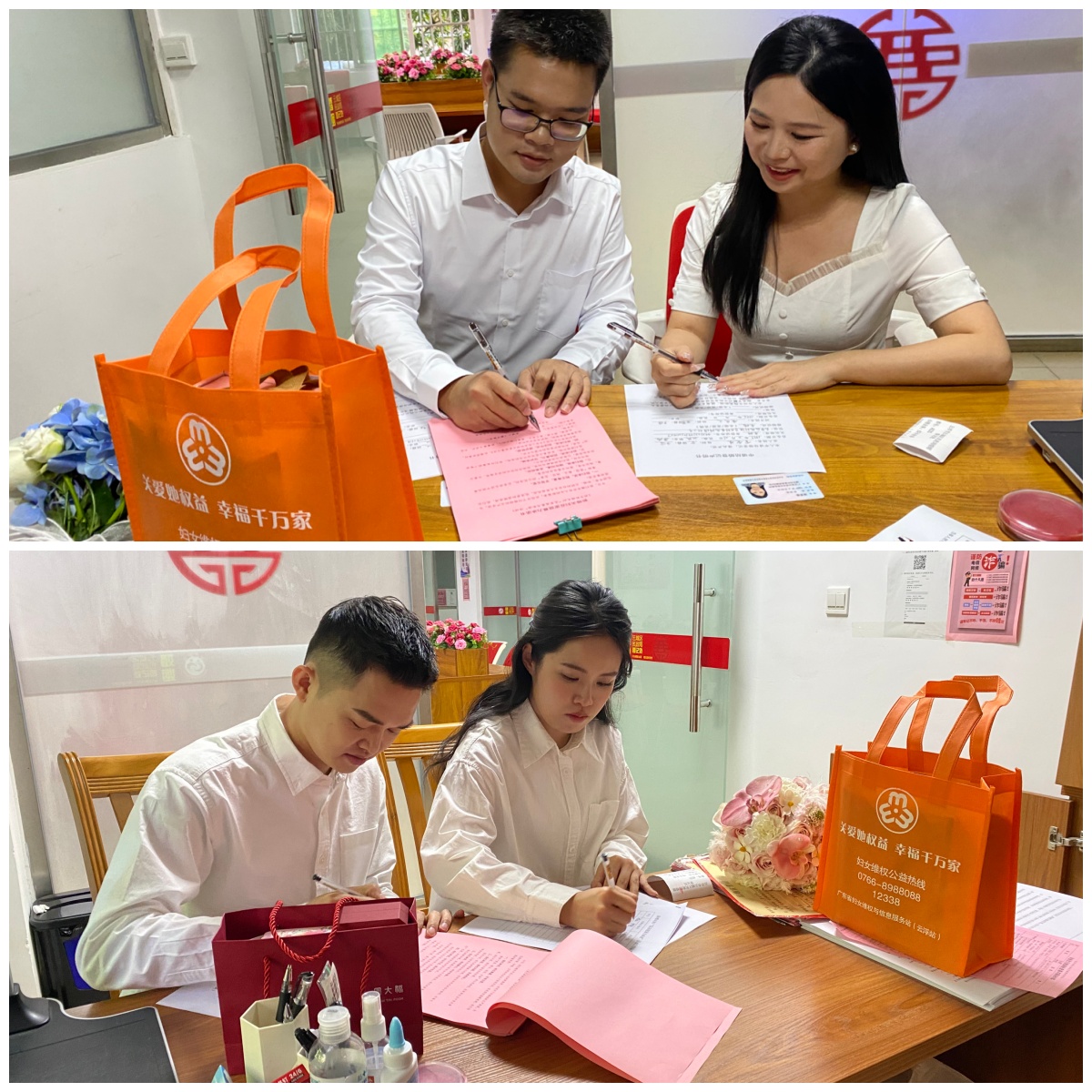 在新婚夫妻签订承诺书活动中,区民政局婚姻登记处的工作人员现场讲解了反家庭暴力的重要意义,倡导新婚夫妇以承诺为约,构建平等、和睦、文明的婚姻家庭关系。新婚夫妻们共同签署《反家庭暴力承诺书》,郑重承诺遵守法律规定,坚决抵制家庭暴力,用责任与担当守护婚姻幸福。活动为每对签订承诺书的夫妻送上“反家暴宣传品”一份,既传递了美好祝福,也让反家暴理念在细节中深入人心。