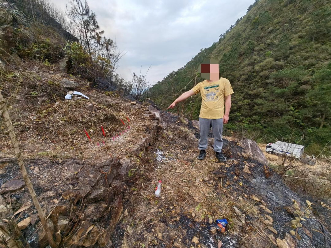 经查,该起山火是戴某某(男,38岁)与其姐姐在罗镜镇云沙村委吴屋寨山上祭扫父亲坟墓时引发的。期间,戴某某违规用火点燃纸钱、元宝拜祭,燃烧着的元宝被风吹出坟堂外引燃周边的干草,进而引发山火。经审讯,戴某某对其违规用火引发山火的行为供认不讳。