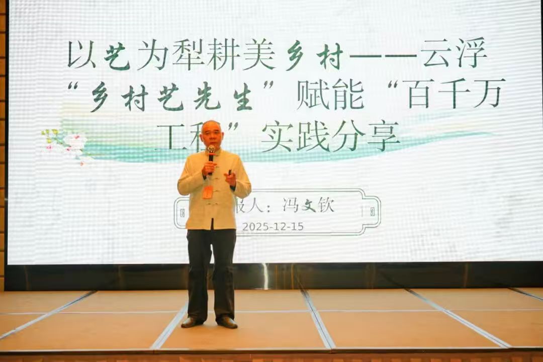 在培训班上,冯文钦代表云浮分享了在文艺赋能“百千万工程”实践中的经验与成果。他表示,今年以来,云浮市文联深入践行习近平文化思想,以“艺起乡见‘百千万’”系列活动为载体,创新推出“乡村艺先生”项目,让文艺真正走进田间地头、走进群众心田。他作为“乡村艺先生”中的一员,策划建成了3000㎡具有产业特色与文艺特色的高龙乡村艺术馆,将石文化与传统书画艺术相融合,探索出“文化+产业+旅游”的融合路径,并联动周边村镇打造“文艺赋能乡村游”精品路线,把艺术馆与田园风光、特色农产相结合,推出“赏书画、玩石艺、品农味”的沉浸式体验,让文化赋能产业增收,让乡村既有“颜值”更有“产值”。同时作为“乡村文艺宣传员”,他打造的《钦言吉语》传统文化小讲堂短视频专栏,以方言解读传统书画、石文化典故、节气农谚等内容,在微信视频号、抖音、快手等平台同步推送,用群众喜闻乐见的形式传播乡土文化。
