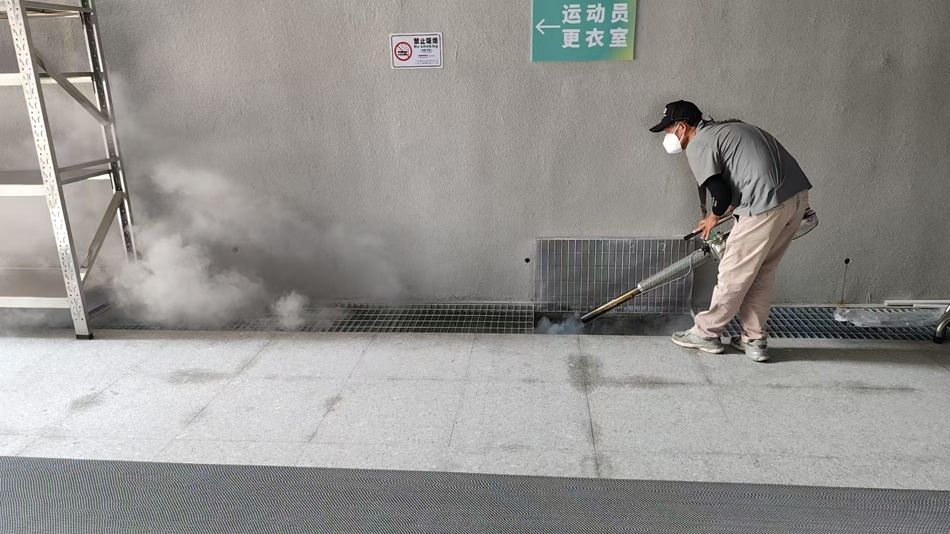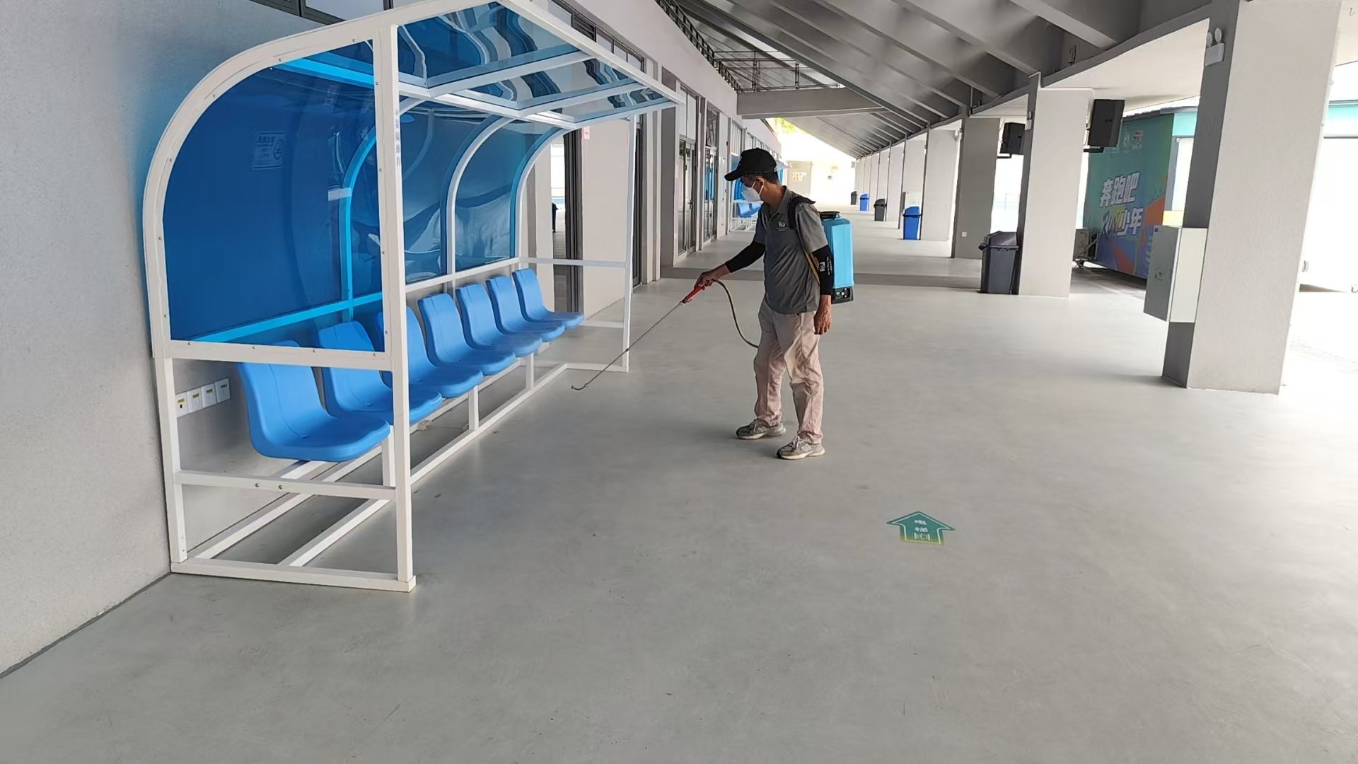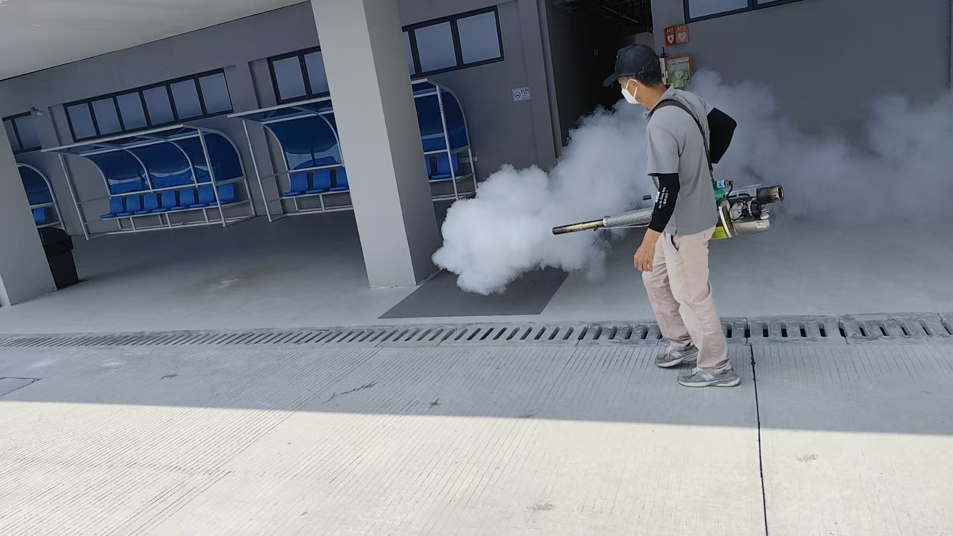 记者在云浮市曲棍球场看到,专业消杀团队正按照“分时分区、精准施治”原则开展作业。工作人员背着电动喷雾器,对看台缝隙、球员通道、裁判休息室等密闭区域,实施长效滞留喷洒,药剂选用符合国家环保标准的高效氯氰菊酯制剂,可在物体表面形成持续防护层。针对场馆外围绿化带、排水渠等蚊虫高频栖息区,消杀人员则启用热烟机进行空间喷洒,借助烟雾渗透力对隐蔽角落进行全域覆盖。