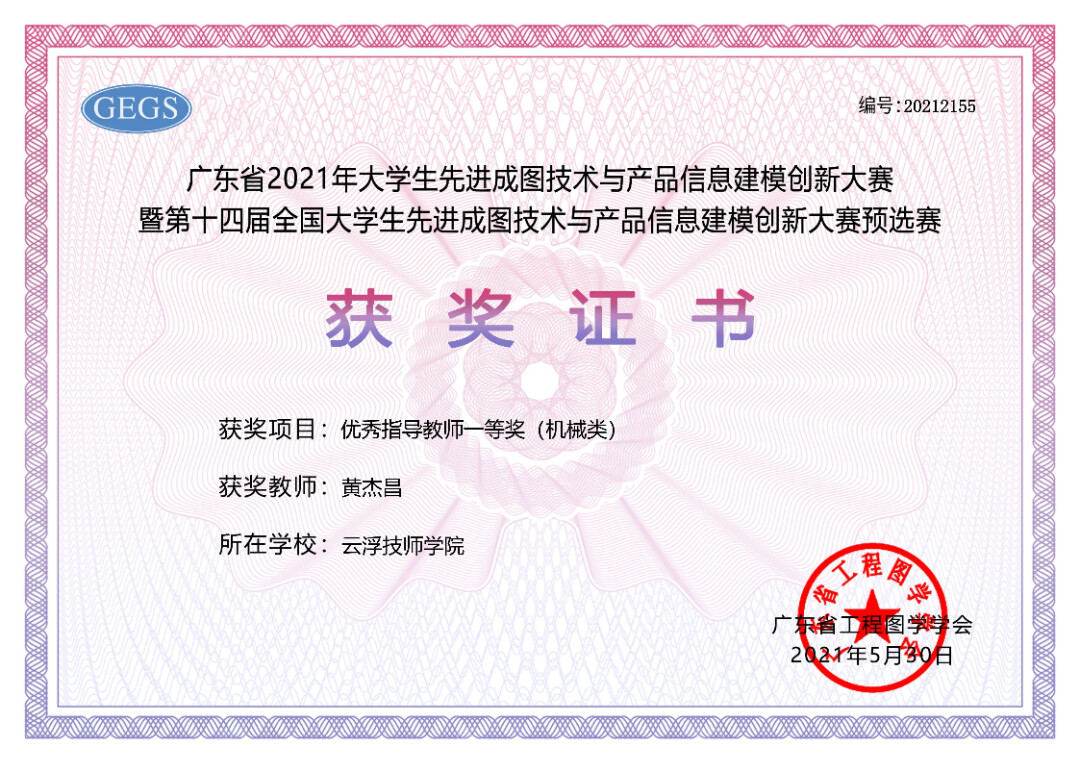 竞赛指导是黄老师的一大亮点。2018年他牵头组建CAD机械设计集训队,五年来指导学生获得省级以上奖项25项,其中国家级一等奖3项。在2021年第十四届“高教杯”全国大学生先进成图技术与产品信息建模创新大赛中,他指导的学生梁伟贤勇夺机械类个人全能一等奖,创造了学院历史最好成绩。2022年,他本人参加广东省多工序数控机床操作调整工竞赛,荣获职工组三等奖,展现了教师与工程师的双重素养。
