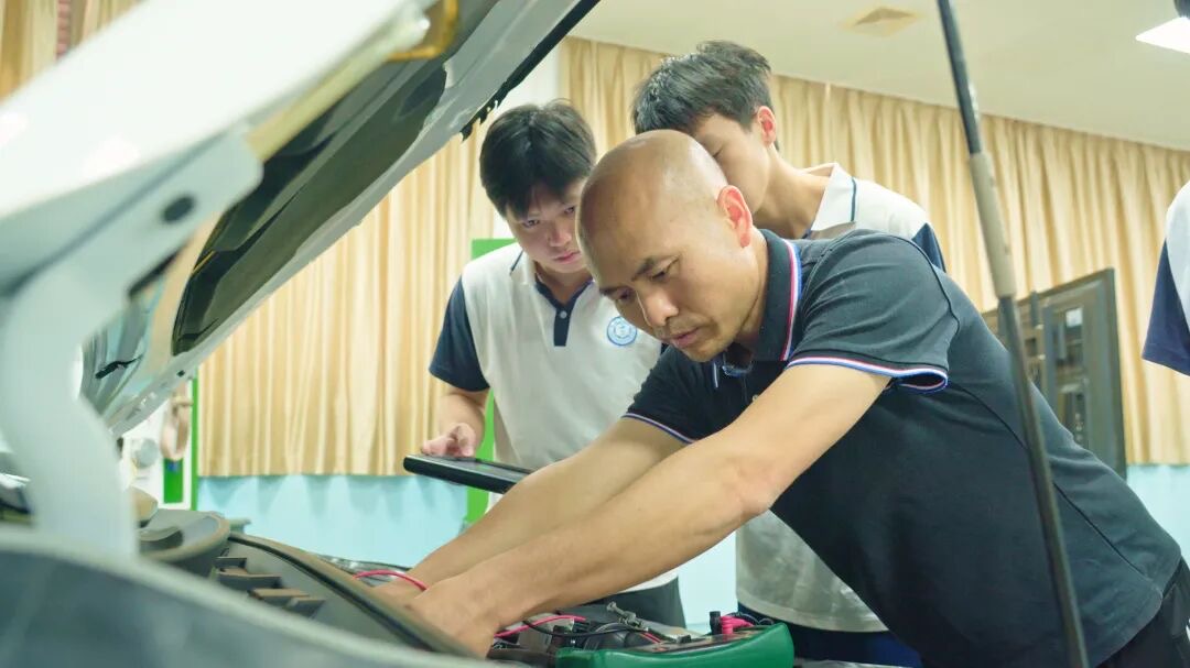 在云浮技师学院宽敞明亮的汽车实训中心,一辆新能源汽车静静地停在工位上。尹平老师站在汽车前,结合实车系统进行示范教学,他一边引导学生观察车辆结构与运行状态,一边系统阐释故障排查要点:“数据流分析要结合系统原理,不能只看单点信号。”这般融理论于实践、寓原理于实景的教学场景,是他十八年教学生涯的日常剪影。