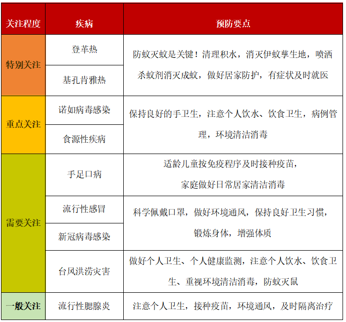 专家提醒: 目前云浮市处于登革热流行季节。10月全市迎来中秋国庆、石展会、十五运会等大型节庆活动,人员流动增加,发生登革热疫情及传播的风险较高。 重点人群及重点场所: 学生群体、老年人、有基础疾病人、孕妇、婴幼儿及建筑工地、城中村、医疗机构、公园、花卉市场、废品收购站等。 主要防控措施: (一)清积水!及时清理室外轮胎、花盆、瓶瓶罐罐等小型积水容器、家里的储水容器、花盆托盘等;水生植物盆栽中可以适当养一些观赏鱼,减少蚊幼虫的产生。 (二)在平时生活中要做好防蚊、灭蚊,比如挂蚊帐,用纱门、纱窗,喷洒杀虫剂;在蚊虫活动高峰时段,要做好防蚊措施后外出。 (三)一旦出现突发高热、皮疹,头、肌肉、关节疼痛等症状,应马上到正规医疗机构就医并配合医生诊治。 在此提醒大家:目前登革热尚无特效药物,治疗的重点是控制疼痛、及时补液、预防出血,并尽早防蚊隔离。 基孔肯雅热 专家提醒: 当前云浮市仍然处于蚊媒活跃期;10月全市迎来中秋国庆、石展会、十五运会等大型节庆活动,人群流动性加大,发生输入性疫情的风险持续升高,不排除本地散发个案增加,甚至局部发生聚集性疫情。 健康提示: 基孔肯雅热是由基孔肯雅病毒引起的一种急性传染病,主要通过伊蚊(俗称“花斑蚊”)叮咬传播,症状以发热、关节剧痛和皮疹为主要特征。多数症状较轻,病程1~2周后可自行恢复,但少数患者可能发生慢性关节疼痛等(持续数月甚至更长时间)。 重点人群及重点场所: 新生儿、老人、慢病患者等三类人群及建筑工地、城中村、医疗机构、公园、花卉市场、废品收购站等。 主要防控措施: (一)环境治理:伊蚊依赖小型积水繁殖,因此清除蚊虫孳生地是预防的根本措施,需定期清理自家房前屋后及屋内积水。 (二)个人防护:外出尽量穿浅色长袖衣裤,减少皮肤暴露面积,裸露皮肤喷涂驱蚊剂。室内安装纱门纱窗,使用蚊帐、电蚊拍等。尽量减少在户外树荫、草丛等蚊子多的地方逗留。 (三)关注流行区疫情:如计划前往东南亚、非洲等或国内发生疫情的流行区,出行前查询当地疫情信息,做好驱蚊防蚊准备。返程后12天内做好健康监测,密切关注身体状况。 (四)及时就医:一旦出现发热、皮疹、关节痛等相关症状应立即就医并告知旅行史和蚊虫叮咬史。 诺如病毒感染 专家提醒: 诺如病毒疫情发病高峰出现在秋冬季节,预计10月全市诺如病毒感染病例数可能出现上升,集体单位出现聚集性疫情风险升高。 健康提示: 诺如病毒是引起急性胃肠炎常见的病原体之一。人群普遍易感,其中学龄前儿童、学生以及老年人是高危人群,做好个人卫生、食品卫生、饮水卫生是预防诺如病毒感染的关键。 主要防控措施: (一)托幼机构、学校等集体单位要严格按照相关规定进行校内环境消毒工作,密切监测缺勤儿童、学生的健康状况,并及时向辖区疾控中心和上级部门报告。 (二)家长要密切关注孩子状态,如果孩子出现呕吐、腹泻等症状,请及时就医,以免延误治疗。患者尽量不要与其他健康人员近距离接触。患者的呕吐和排泄物需穿戴手套和口罩等防护用品后,再用含氯消毒剂进行消毒。 (三)认真清洗水果和蔬菜,正确烹饪食物,尤其是食用贝类海鲜等高风险感染诺如病毒的食品应保证彻底煮熟。 (四)保持良好的手卫生是预防诺如病毒感染和控制诺如病毒传播最重要和最有效的措施。 食源性疾病 10月气温较9月虽有所下降,但仍然相对较高,湿度也较大,适于细菌等各种病原微生物的生长繁殖和毒蘑菇、有毒植物的生长,是引起食源性疾病的高发季节,同时,学校集体食堂存在发生食源性疾病聚集/暴发事件的风险,国庆期间旅游人流和餐饮消费增加,细菌性食源性疾病暴发风险增加。 主要防控措施: (一)注意用餐卫生。外出就餐应选择正规的、卫生环境良好的餐馆,在家注意生、熟分开,食物要煮熟煮透,生吃蔬果要洗净,不喝生水。做饭注意适量,少吃或不吃剩饭剩菜,如有剩余需放入冰箱保存。 (二)注意个人手卫生。饭前便后、接触宠物、处理垃圾之后要勤洗手,处理食物前后要认真洗手。 (三)外出郊游时不自行采摘、食用野生蘑菇和野生植物,一旦误食,出现呕吐、腹泻等食物中毒症状,要及时去医院就诊,以免延误病情。 手足口病 专家提醒: 10月云浮市手足口病发病可能继续保持下降趋势,但学校和托幼机构等集体单位仍然存在发生聚集性疫情风险,不排除有零星重症病例出现。 健康提示: 手足口病是由多种肠道病毒引起的常见传染病,多发生于5岁以下儿童,表现为发热及手、足、口腔、臀部等部位皮肤黏膜出现皮疹、疱疹或溃疡。手足口病的传播途径包括直接接触传播、飞沫传播、消化道传播等,主要通过接触患者鼻咽分泌物、唾液、疱疹液、排泄物,以及接触被污染的玩具、日用品和衣物等物品传播。 主要防控措施: (一)保持良好的手卫生。尤其是饭前便后以及外出游玩回家后要用肥皂或洗手液和流动水洗手。 (二)勤通风。居室要勤开窗,多通风,少去人流密集、空气不流通的场所。 (三)远病患。手足口病具有较强的传染性,应避免亲密接触病人,不建议跟病人拥抱或分享玩具、餐具、洗浴用品等,避免感染。 (四)做好消毒工作。经常清洗、消毒孩子使用的餐具、奶瓶、奶嘴、玩具等餐具和用具。 (五)接种疫苗。EV71是更容易导致手足口病例发展为