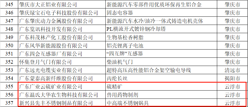 近日,广东省工业和信息化厅网站公示2024年广东省省级制造业单项冠军企业通过名单,其中,云浮市3家企业榜上有名!分别是:广东广业云硫矿业有限公司、广东温氏大华农生物科技有限公司、新兴县先丰不锈钢制品有限公司。
