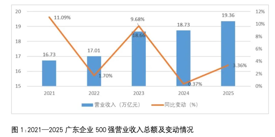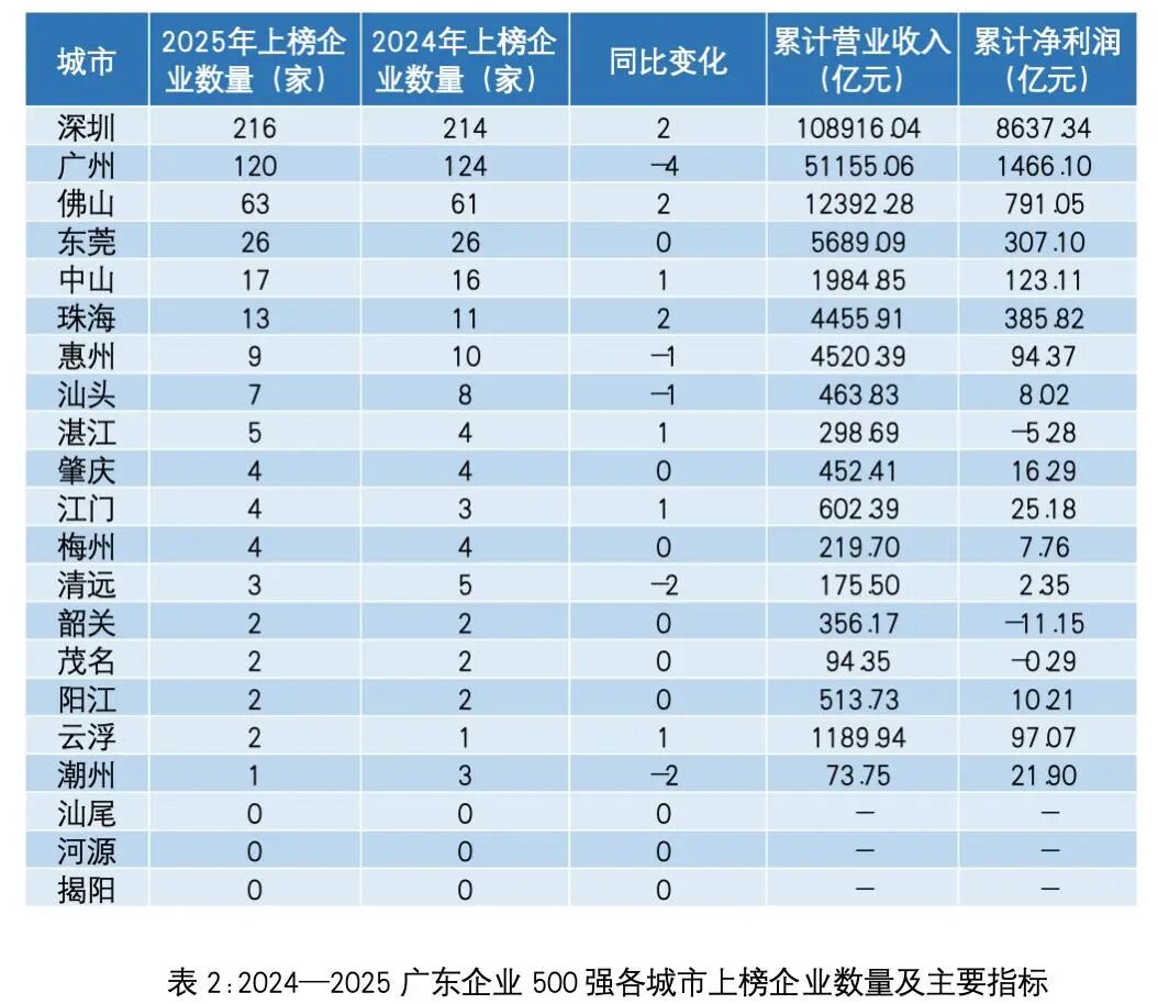 云浮2家企业入选2025年广东省企业500强,分别是温氏食品集团有限公司、广东金晟兰冶金科技有限公司。其中,金晟兰是首次上榜广东省企业500强。 报告显示 500强企业总营业收入达 19.36万亿元 资产总额突破68万亿元 企业研发投入总额 高达5849.61亿元 营收总额突破19万亿元 创历史新高 2021至2025年间,广东企业500强营业收入总额从16.73万亿元持续攀升至19.36万亿元,总量创历史新高,2025年增速为3.36%,较2024年有明显回升,显示出较强的周期韧性。 资产规模同样稳步扩张。2021至2025年,广东企业500强资产总额从56.62万亿元持续扩大至68.33万亿元,五年间累计增长超过11万亿元,显示出企业综合实力持续夯实。 在“硬指标”稳步增长的背后 是企业对科技创新的投入 2025年广东企业500强 研发费用总额 达到5849.61亿元 可见,广东头部企业正将创新资源更多投向基础研究和关键核心技术领域,推动研发活动从量变积累向质变突破跃迁。 从行业结构看,知识密集型领域表现尤为活跃。科学研究和技术服务业以18.99%的研发强度高居榜首,研发费用达1916.49亿元;作为经济压舱石的制造业,以2795.08亿元的研发费用总额占据规模优势。 在资产、营收保持增长的同时,企业纳税总额呈现稳步下调,从2021年的9012.71亿元逐步调整至2025年的6811.91亿元,五年间累计减少超过2200亿元。“两增一降”的变化,反映出减税降费政策持续发力,为企业加大研发投入和扩大再生产创造了更有利的条件。 区域协同,“珠三角创新辐射 +粤东西北特色承接” 具体从区域布局看,珠三角地区的500强企业营收占比高达98.25%,净利润占比98.91%;从城市分布看,企业营收呈“中心强、边缘弱”的区域分布格局。其中,深圳以216家企业保持绝对领先地位,累计营收突破10万亿元,净利润达8637亿元;广州虽企业数量略有减少(120家),但仍以5.1万亿元营收稳居第二。佛山(63家)、东莞(26家)等珠三角城市表现稳定,形成坚实的第二梯队。 报告建议,构建“珠三角创新辐射+粤东西北特色承接”的区域协同体系。支持广州深圳等中心城市龙头企业在粤东西北布局产业化基地,推动技术、资本、人才跨区域流动;同时在粤东西北聚焦绿色能源、现代农业等优势领域,建设特色产业创新平台,形成错位发展格局。唯有破解效益与协调难题,广东经济方能实现全域高质量跃升。 附:广东500强企业名单