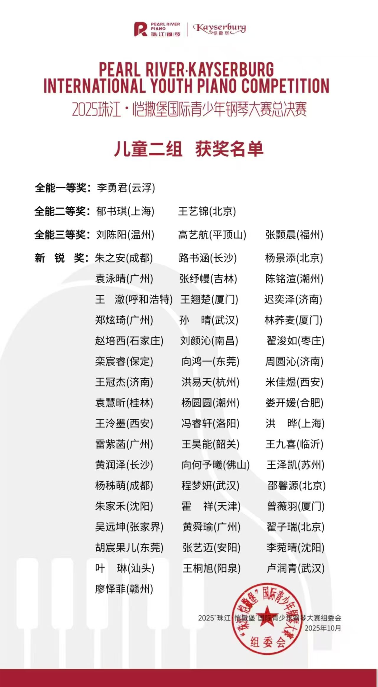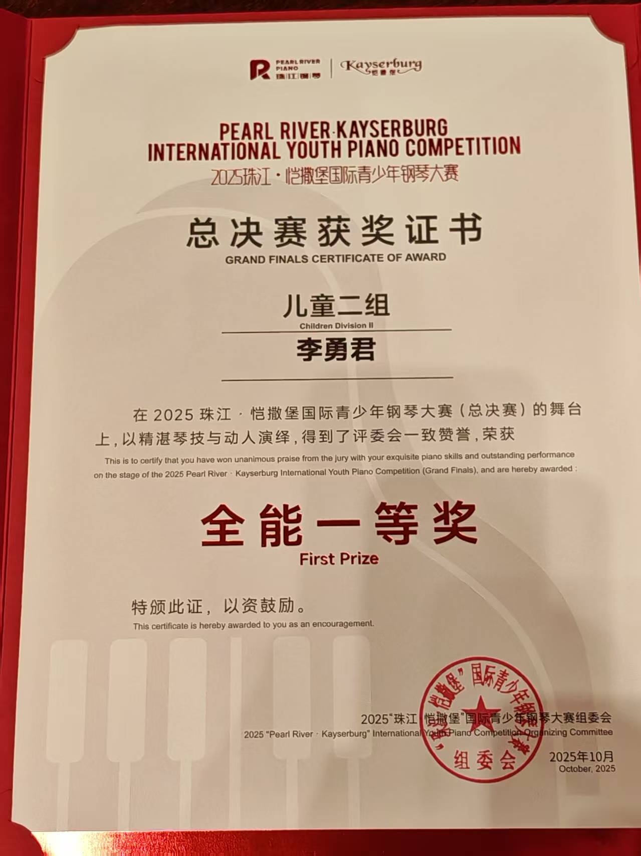 日前,2025珠江·恺撒堡国际青少年钢琴大赛总决赛在厦门圆满落幕。云浮市选手李勇军凭借精湛的演奏技艺和深刻的音乐表达,在众多参赛选手中脱颖而出,斩获儿童二组一等奖,为全市赢得荣誉。