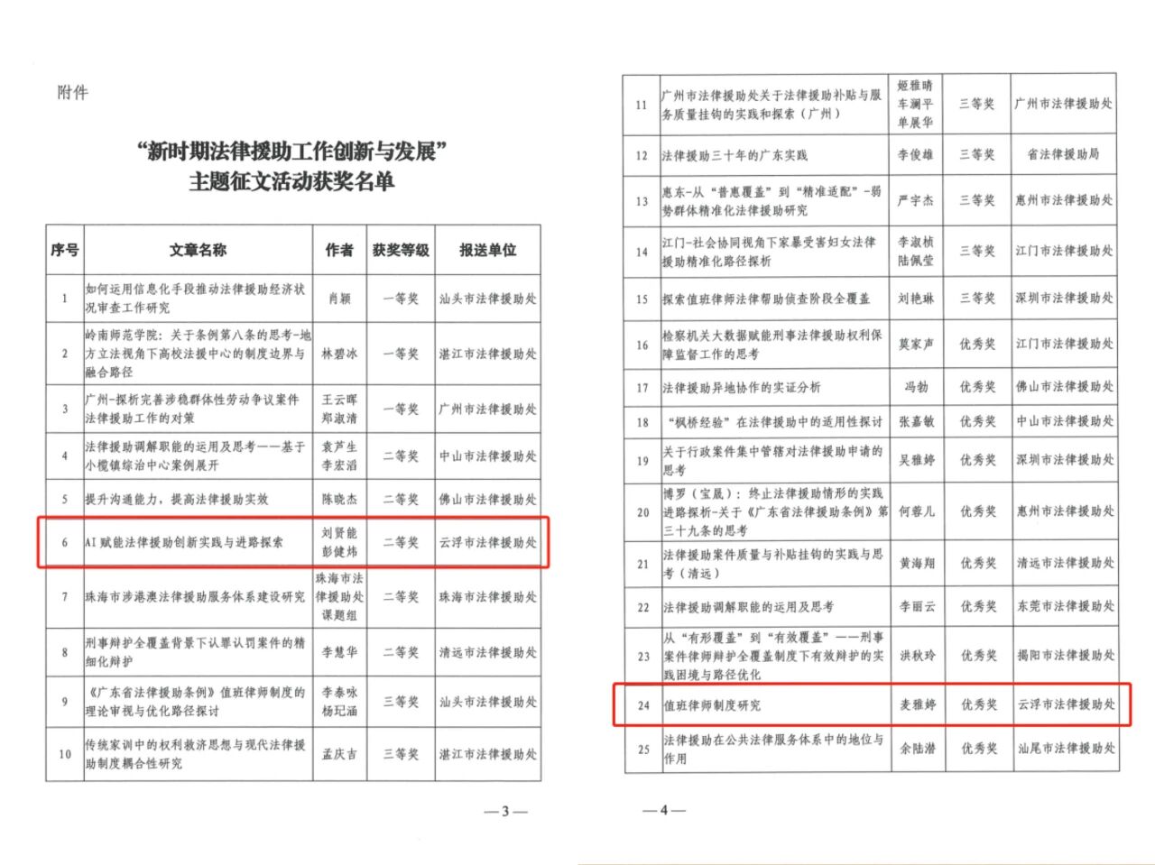 广东省法律援助局举办的“新时期法律援助工作创新与发展”主题征文活动评选结果出炉,经专家评审委员会两轮严谨评审,从全省征集的参选文章中评选出25篇获奖文章。其中,云浮2篇征文分别获评二等奖和优秀奖。