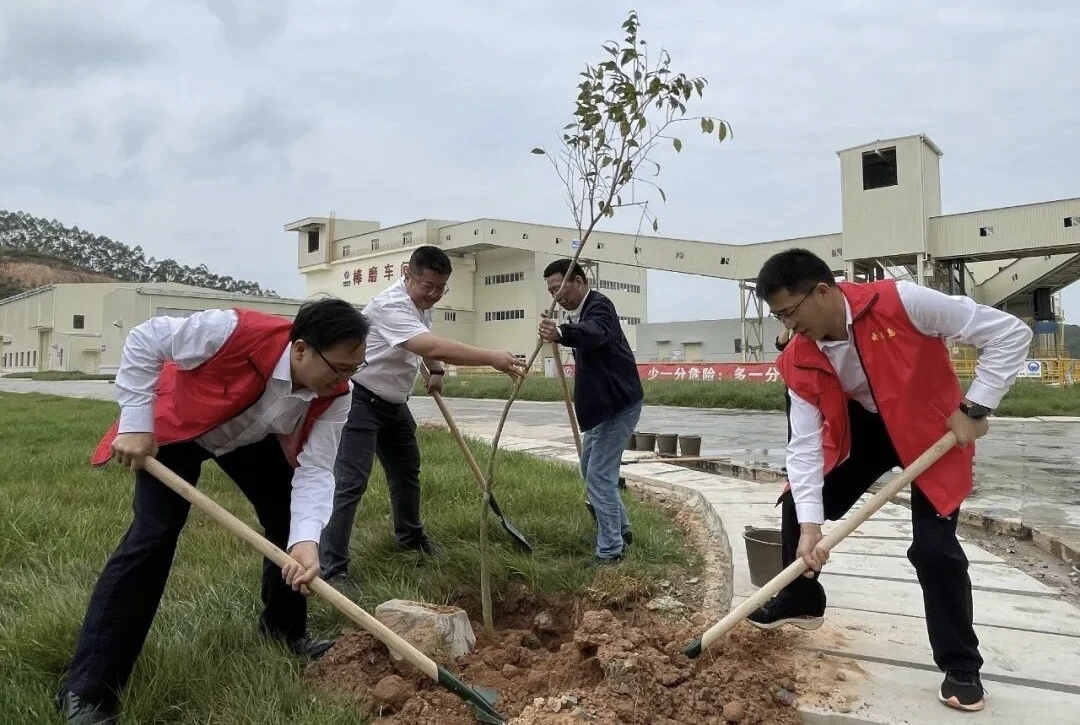 植树现场,党员干部精神饱满、干劲十足、分工协作,挥锹铲土、扶苗填坑、提水浇灌,用心栽下一棵棵沉香树苗。100余棵新苗在加工区道路两侧昂然挺立,迎风舒展,为矿山增添一片新绿,为初春的矿区注入了勃勃生机。