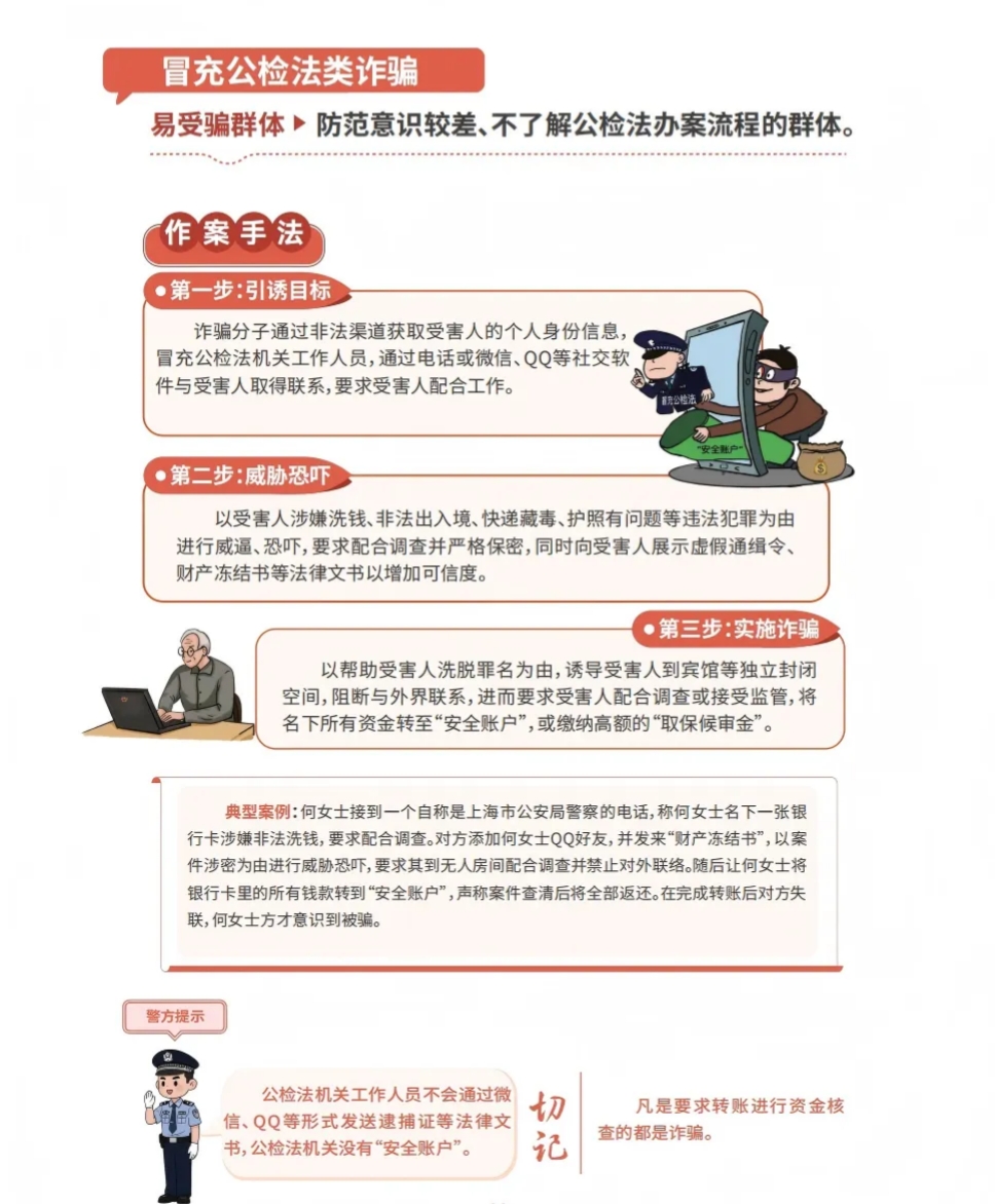 公安机关指出,个人信息泄露危害极为严重:不仅直接导致财产受损,泄露的姓名、身份证号、住址等信息更会使受害人成为精准诈骗的“猎物”,诈骗分子可据此伪装成客服、公检法、熟人等实施诈骗,大大降低受害人的警惕性。云浮市公安局侦查中心民警黄昕明表示:“凡是电话里自称公安、检察院、法院,说你涉嫌犯罪、涉案洗钱、账户冻结,要求保密、转账验资、资金核查,把钱转到‘安全账户’的,全是诈骗!公检法机关绝不会电话办案、网上查验资金、要求转账汇款。”