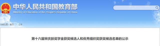 6月20日,教育部公示第十六届宋庆龄奖学金获奖候选人和优秀组织奖获奖候选名单。