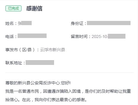 接报后,新兴县公安局反诈中心高度重视,立即启动紧急止付和案件侦查程序。最终成功完成资金拦截,为事主挽回经济损失。在整个案件处理过程中,民警耐心细致的沟通、专业精准的操作以及一心为民的态度,给张先生留下了深刻印象,使其深切感受到了公安机关的温暖和力量。