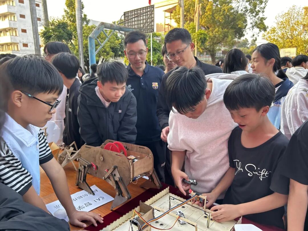 活动在简洁而热烈的开场中启动。在科技作品展示区,水台中学学生们创作的“四足机器人”“3D打印作品”“智能垃圾分类装置”“AI智学灯”等作品琳琅满目,兼具创意与实用性,吸引了众多师生驻足交流。创作者们现场讲解、演示,展现了出色的综合素养与实践能力。