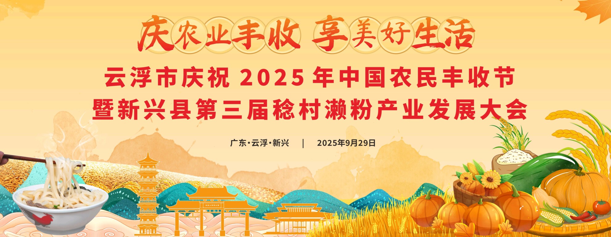 金秋送爽,五谷丰登。明天(9月29日)下午,云浮市庆祝2025年“中国农民丰收节”主会场活动将在新兴县稔村镇文体活动中心广场盛大启幕。本次市级丰收盛会特别结合新兴县第三届稔村濑粉产业发展大会同步举办,以“庆农业丰收 享美好生活”为主题,全景展现云浮乡村振兴新画卷,推动地方特色产业高质量发展。