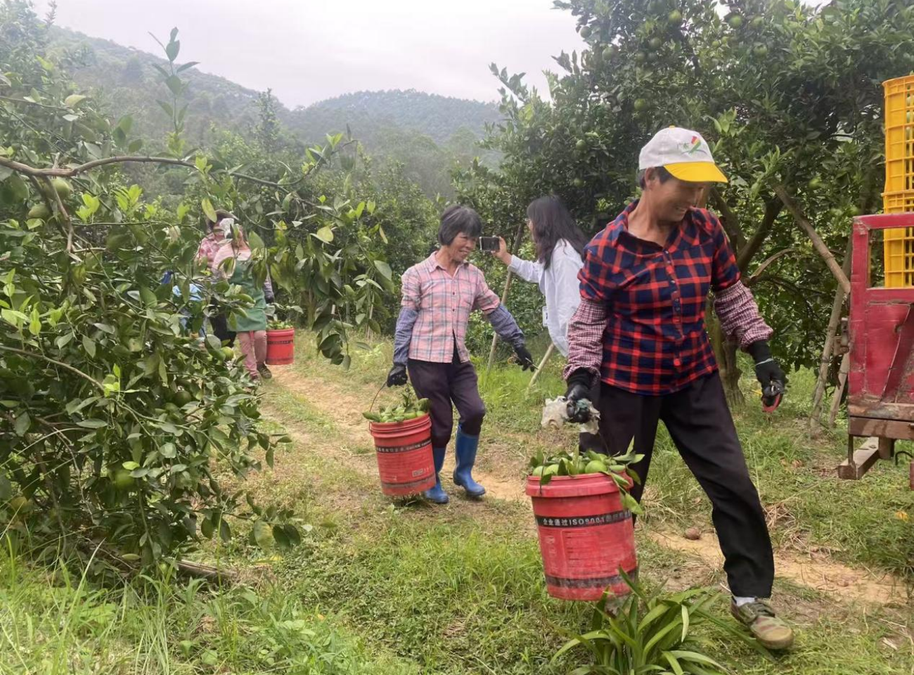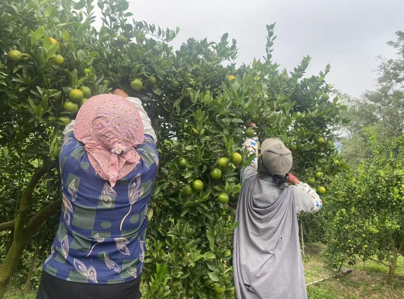工人们手执果剪、果径圈,在果树间熟练地进行采摘