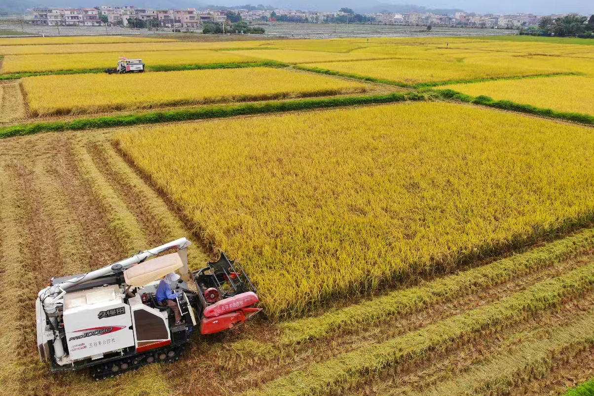 在丝苗米产业园种植基地,金黄的稻田接连成片,沉甸甸的稻穗随风荡漾,形成层层金色稻浪。收割机在农田里往来穿梭,割稻卷穗,稻茬瞬间分离,颗粒归仓,收割现场一派丰收景象。