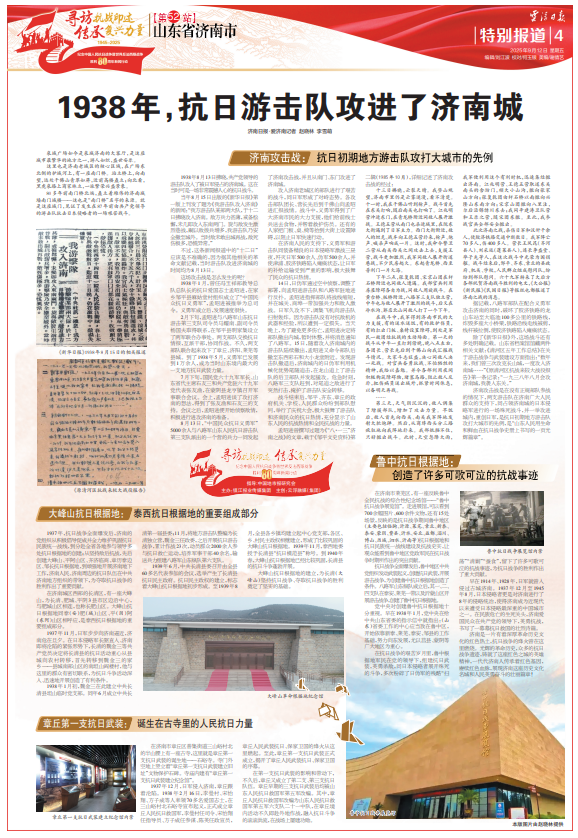 大峰山革命根据地纪念馆 泉城广场如今是泉城济南的大客厅,是这座城市最繁华的地方之一,游人如织,盛世安乐。 这里也是济南老城区的核心区域,在广场东北侧的护城河上,有一座南门桥。站立桥上,向南望,远处千佛山青翠如屏,近前高楼矗立;向北看,黑虎泉路上商家林立,一派繁荣兴盛景象。 80多年前南门桥北端,矗立着雄伟的济南城墙南门城楼——这也是“南门桥”名字的来源。就是这座城门,见证了发生在87年前由共产党领导的游击队抗击日本侵略者的一场艰苦战斗。 济南攻击战:抗日初期地方游击队攻打大城市的先例 1938年8月13日拂晓,共产党领导的游击队攻入了被日军侵占的济南城。这在当时可是一场非常震撼人心的抗日战斗。 当年8月15日出版的《新华日报》第一版上刊发了题为《我游击队攻入济南》的新闻:“我方游击队某部两大队,于十二日拂晓攻入济南。敌方兵力甚薄,戒备松懈,未几即攻入东南两门。旋与敌发生激烈巷战,嗣以敌拨兵增多,我游击队乃安全撤至城外。当时敌未敢出城再战,敌死伤极多,恐慌异常。” 不过,这条新闻报道中的“十二日”应该是不准确的,因为据其他相关的革命文献记载,当时游击队攻进济南城的时间均为8月13日。 《新华日报》1938年8月15日的相关报道 这场攻击战是怎么发生的呢? 1938年1月,曾任冯玉祥部教导总队总队长的抗日爱国志士孟昭进,在家乡邹平县麻姑堂村组织成立了“中国民众抗日义勇军”,孟昭进被推举为总司令。义勇军成立后,发展速度很快。 2月下旬,孟昭进与八路军山东抗日游击第三支队司令员马耀南、副司令员杨国夫取得联系,在邹平县明家集设立了两军联合办事处。两支部队交换抗日情报,互派干部,协同作战。不久,两支部队联合起来攻下了章丘、济阳、莱芜等县城。到了1938年5月,义勇军已发展到1万余人,成为当时山东境内最大的一支地方抗日武装力量。 7月下旬,国民党六十九军军长、山东省代主席石友三和共产党驻六十九军党代表张友渔,在蒙阴县龙亨镇召开军事联合会议。会上,孟昭进谈了攻打济南的想法,得到了张友渔和石友三的支持。会议之后,孟昭进便开始侦察敌情,积极进行进攻济南的准备。 8月13日,“中国民众抗日义勇军”5000余人与八路军山东人民抗日游击队第三支队派出的一个营的兵力一同发起了济南攻击战,并且从南门、东门攻进了济南城。 攻入济南老城区的部队进行了艰苦的战斗,同日军形成了对峙态势。各攻击部队团长、营长先后到千佛山向孟昭进汇报战情。战斗中,义勇军得到了广大济南市民的大力支援,他们给前线士兵送去食物,并帮着救护伤员。还有的人家把门板、桌、椅等抬到大街上设置障碍,以阻止日军快速行动。 在济南人民的支持下,义勇军和游击队同装备精良的日本侵略军激战三昼夜,歼灭日军500余人、伪军500余人,并使津浦、胶济铁路陷入瘫痪状态,让日军的补给运输受到严重的影响,极大鼓舞了民众的抗日热情。 14日,日伪军通过空中侦察,调整了部署,向孟昭进游击队和八路军驻地进行反扑。孟昭进指挥部队将战线缩短,并在城关、商埠一带加强兵力和敌人激战。日军久攻不下,调集飞机向游击队扫射轰炸。因为游击队没有对抗敌机的武器和经验,所以遭到一定损失。当天晚上,为了避免更多伤亡,孟昭进决定将部队撤出内城,暂时休整,并将消息通知了八路军。15日,随着攻入济南城内的游击队陆续撤出,孟昭进又命令部队后撤至东西彩石和大小龙堂附近。发现游击队撤退后,济南城内的日伪军利用机械化优势尾随追击,在龙山追上了游击队的后卫部队并发起猛攻。危急时刻,八路军三支队赶到,对尾追之敌进行了突然打击,掩护了游击队安全转移。 战斗结束后,邹平、齐东、章丘的政府机关、学校、人民群众纷纷到部队慰问,举行了庆祝大会,极大鼓舞了游击队和济南民众的抗日热情,充分显示了山东人民的抗战热情和全民抗战的力量。 孟昭进曾撰写过题为《“八·一三”济南之战》的文章,载于《邹平文史资料》第二辑(1985年10月),详细记述了济南攻击战的经过: 十三日拂晓,云裂天晴。我登山观望,济南市里仍是云雾迷漫,看不清楚。十一时,我在千佛山听到枪声。战斗首先在东关打响,随后南关也打响了。江兆明营冲进东门,在青龙桥附近同敌人展开激战。王德五营从南门也杀进城里,在院东大街遇到了日军主力。西门大街附近,敌人的坦克、战车向王德五营扑来,枪声、炮声、喊杀声响成一片。这时,我命令警卫二营从南关西关之间攻击上去,支援王营,战斗更加激烈,我军同敌人展开街道巷战,不少民房起火。东起青龙桥、西至普利门一片火海。 下午二点,张复乾团、宋京山团在杆石桥附近也同敌人遭遇。我部官兵利用房屋障碍各自为战,同敌人周旋战斗。在黄台桥、板桥附近,八路军三支队独立营,中午也与敌人展开了激烈的战斗,后又在冷水沟、郭店北山同敌人打了一个下午。 在战斗中,我军得到济南市民的大力支援,有的送水送饭,有的救护伤员,有的扛出门板、桌椅设置障碍,到处是军民一致团结抗战的生动场面。第一天的战斗从中午一直打到傍晚,晚八点左右,各团长、营长先后到千佛山向我汇报战斗情况。大家斗志旺盛,决心同敌人决一死战。对官兵奋勇抗战、不怕牺牲的精神,我给以嘉勉。并令各部利用夜间积极构筑障碍物,堵塞马路,