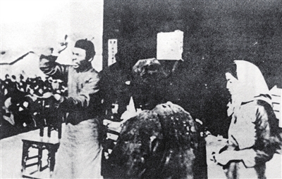 抗敌青年团学员表演街头剧,进行抗日宣传。翻拍自《徐州抗战画史》