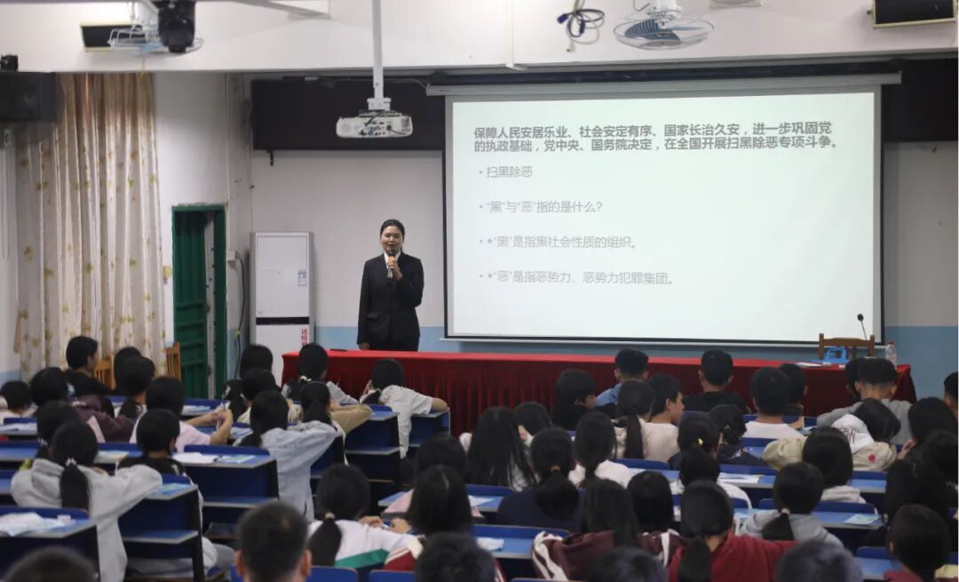 在扫黑除恶宣传教育环节,普法干警以《反有组织犯罪法》为切入点,向师生们阐释了常态化扫黑除恶的重大意义,解释了什么是“黑恶势力”,分析了其常见的表现形式:如校园欺凌、“套路贷”、暴力讨债等,重点强调了黑恶势力对正常社会秩序、校园安全和青少年成长的严重威胁。
