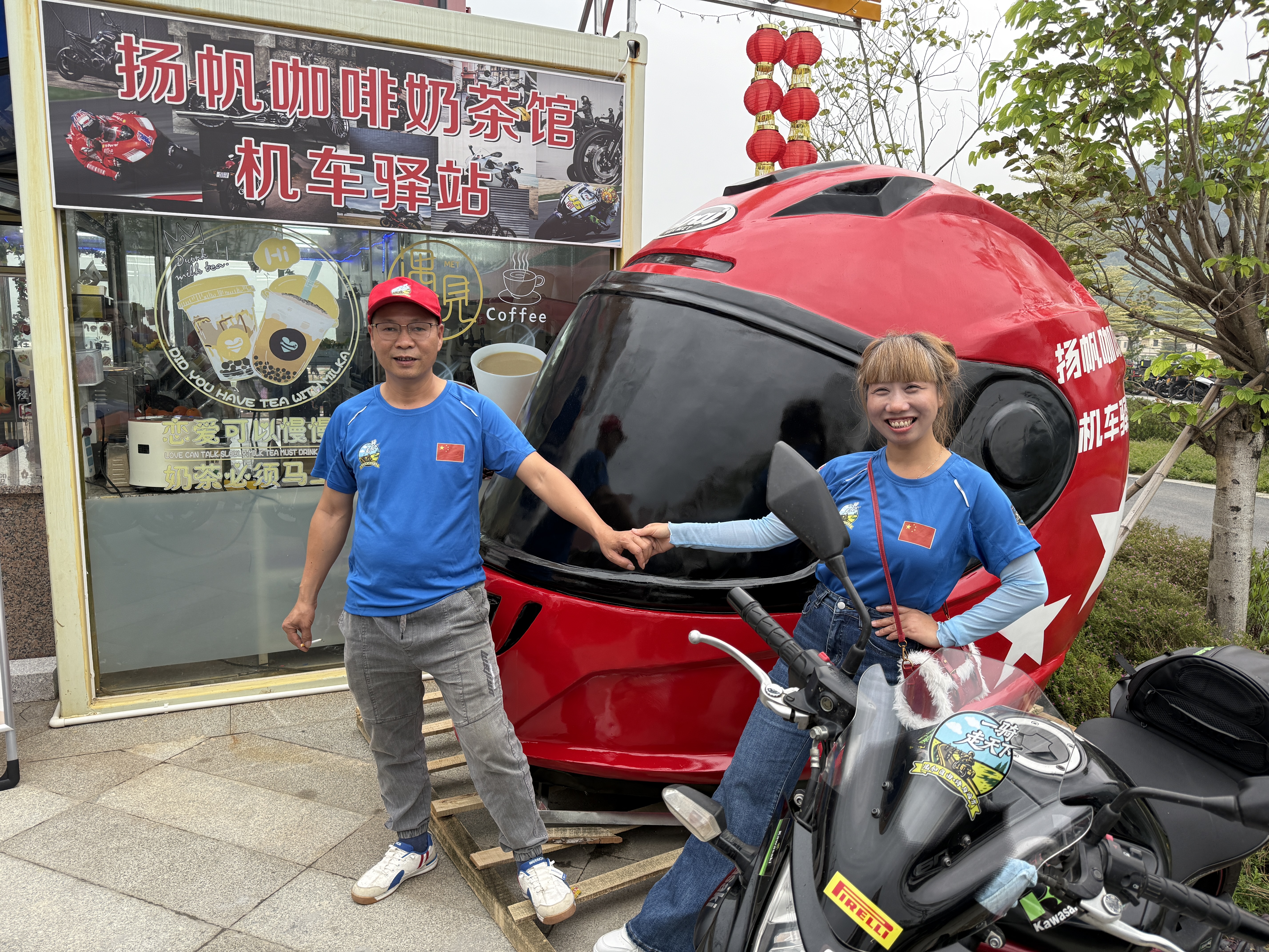 近日,云浮市云安区都杨镇湾边村的西江畔·湾边机车驿站热闹非凡。记者在现场看到,多辆机车一字排开,车友们三五成群,或品咖啡,或欣赏江景,畅聊骑行趣事。驿站负责人还专门定制了户外大型摩托头盔造型摆件,吸引不少人驻足拍照。