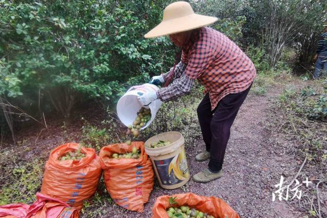 霜降过后,云浮市云安区高村镇种植的油茶陆续进入采摘期,村民正趁着晴好天气采摘,确保油茶“硕果归仓”。