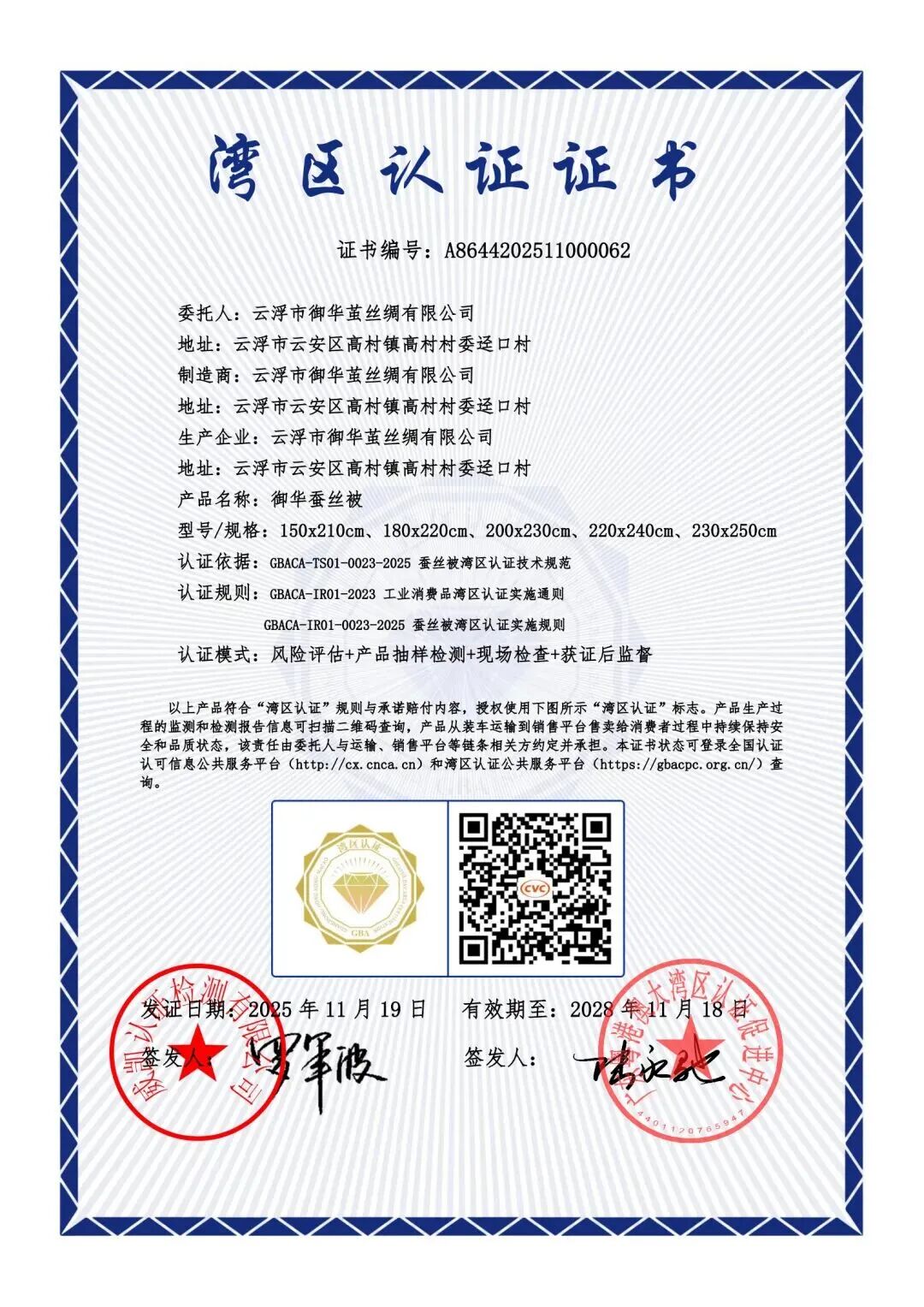 “御华蚕丝被”的核心竞争力,源于其获得的全国蚕丝行业首张“湾区认证”证书。该认证基于粤港澳三地互认标准,并引入质量信息公示、承诺赔付等严格制度,标志着产品完全符合大湾区高端市场准入要求。