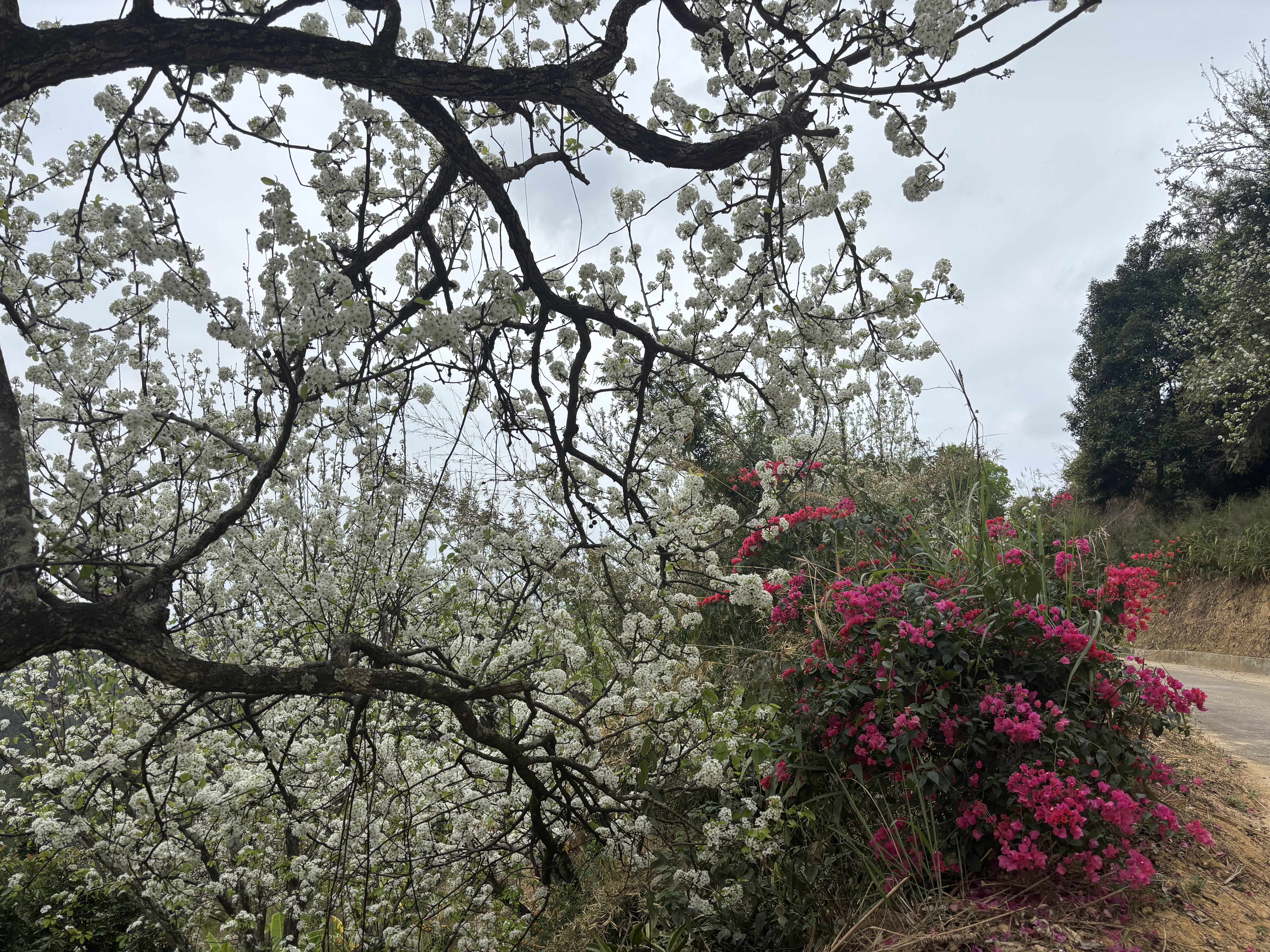 春日的金山村生机盎然,漫山梨树繁花满枝、雪瓣轻扬,蜂蝶翩飞;路旁簕杜鹃热烈绽放、娇艳芬芳,红白相映的美景格外耀眼,引得游客纷至沓来打卡赏景,山间田野满是欢声笑语。“现在春天,正值梨花开,有人发的视频看到好美,就过来感受一下春天的气息,一片一片好白,有风吹时好像下落雪般,好美。”“真的好美,风景优美,真的值得来看的,这边和那边是不同的景色,这边就是梨花多,比较清雅一点,这边比较热烈点。三角梅开得很灿烂,值得来看,真的是山清水秀。”前来游玩的游客表示。