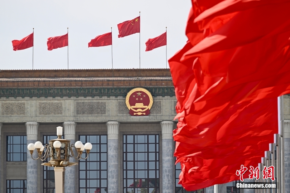 资料图:人民大会堂前红旗飘飘。中新社记者 何蓬磊 摄