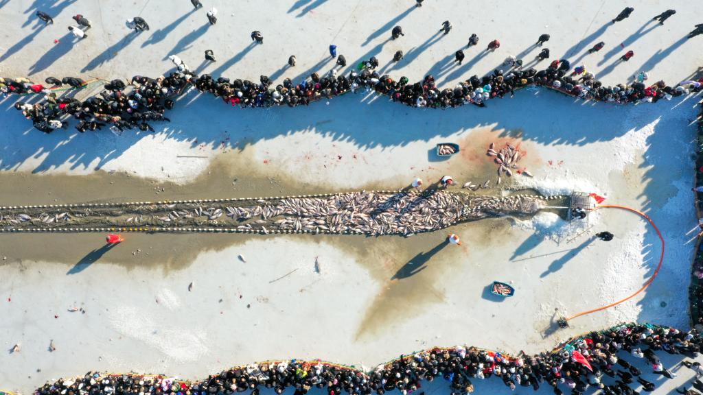 游客在吉林省松原市查干湖第23届冰雪渔猎文化旅游节上观看冬捕(2024年12月28日摄,无人机照片)。新华社记者 张楠 摄