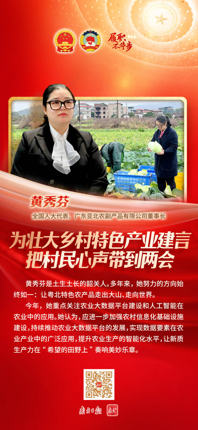“今天,我不仅是代表自己发声,更是代表粤北乡村千千万万的乡亲,代表无数希望农业更强、农村更美、农民更富的朋友。”从“农民创业者”,再到致力于推动农业现代化的实践者,黄秀芬勤勉履职、步履不停。